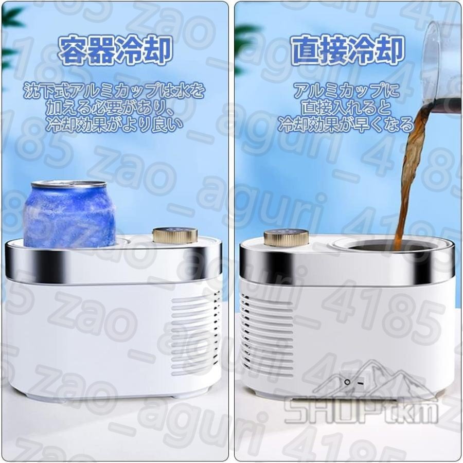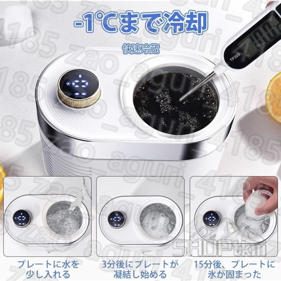 2種類の冷凍方法:流し込み式は、カップに飲み物や食べ物を入れて3分間冷蔵するだけで-1℃が可能です。沈下式はカップに少量の水を入れた後、缶やベットボトルを入れて15分間冷蔵するだけで-1℃が可能です。