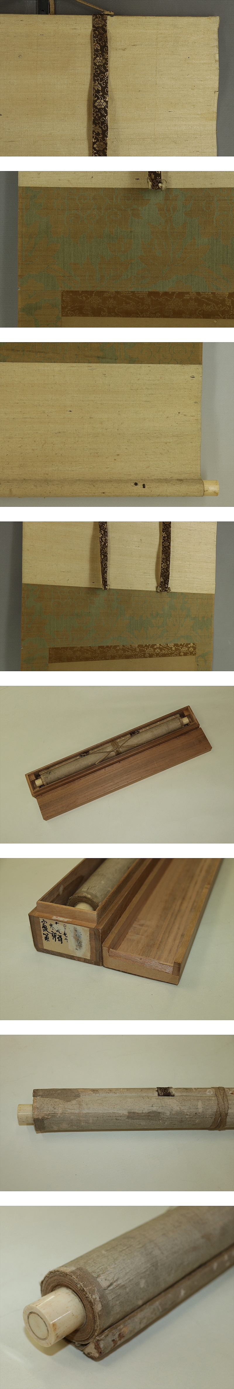 狩野時信 かのう-ときのぶ (1642-1678) 戸時代前期の画家。寛永19年6月13日生まれ。狩野安信の長男。 父の跡をうけて中橋狩野家をつぎ,奥絵師となる。 御所や江戸城本丸の障壁画制作に参加。 延宝6年10月6日死去。37歳。号は右京。 本紙は、染み、汚れ、折れ、皺、擦れ、ヤケ、虫食があります。 表装は、染み、汚れ、折れ、皺、虫食、破れ、ほつれ、軸先に汚れ、箱の蓋に傷みがあります。 【サイズ】 作品 横約36.5cm×縦約90cm 表装 横約47.5cm×縦約171cm |