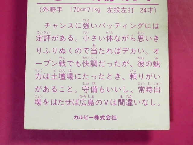 ・販売:カルビー株式会社 ・サイズ: 6.5 cm x 5.0 cm ・素材:紙 ・中古扱い ・30年以上経過しているカードです。状態は画像をご確認ください。 |