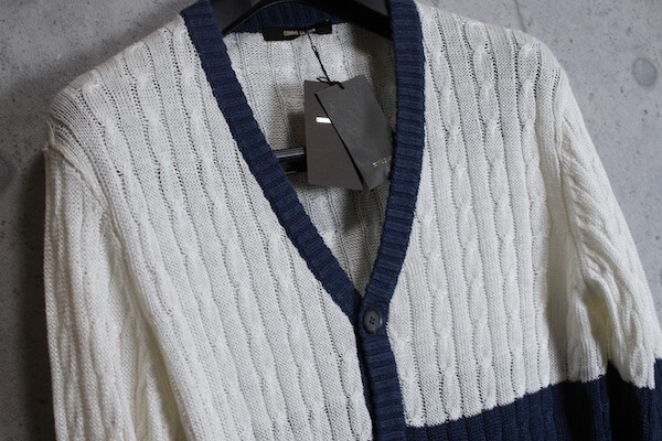 新品 コムサメン 春夏 ミドルゲージ リネン100% バイカラー ニット サマー カーディガンL/白紺/定価2.5万円/COMME CA MEN/麻/