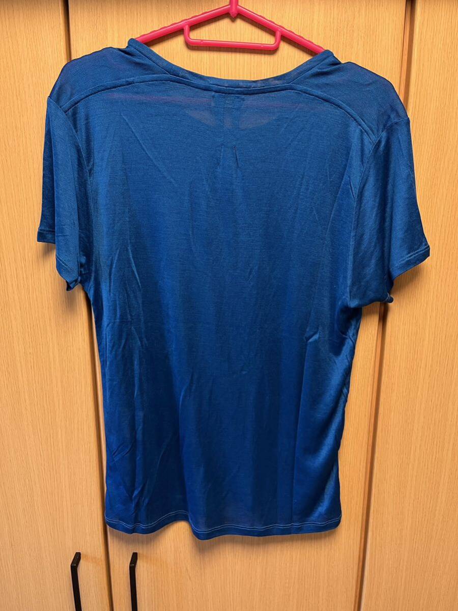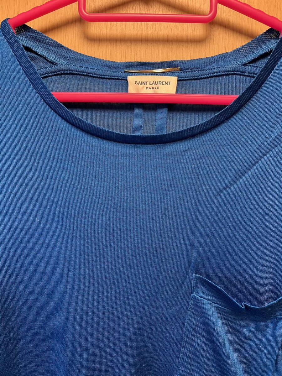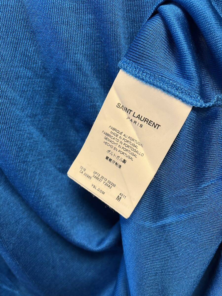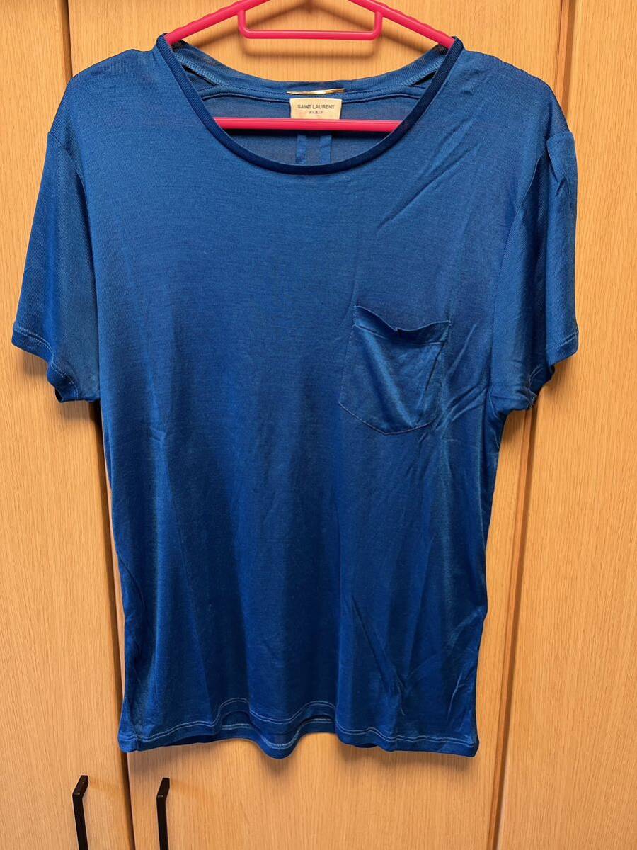 正規 14SS SAINT LAURENT PARIS サンローラン パリ Hedi Slimane エディスリマン シルク 胸ポケット Vネック Tシャツ カットソー 蛍光 ネオンブルー 青 M