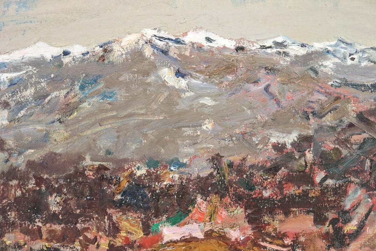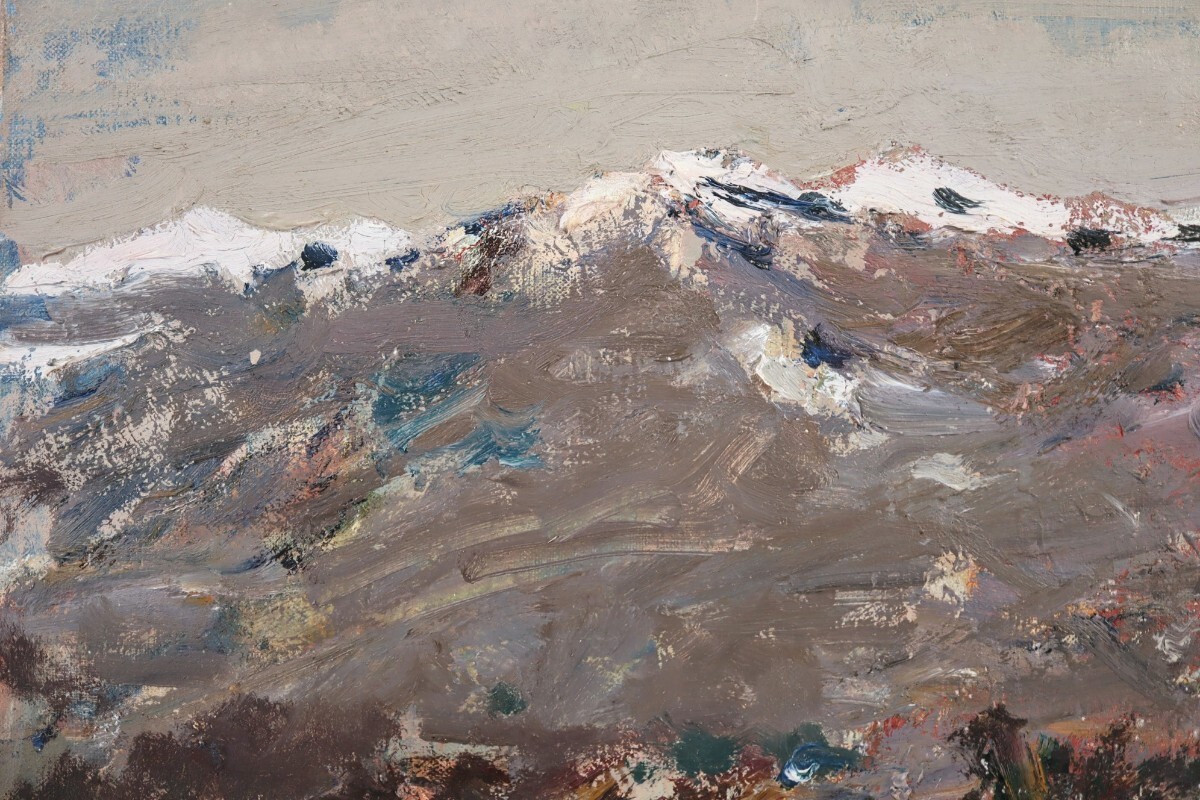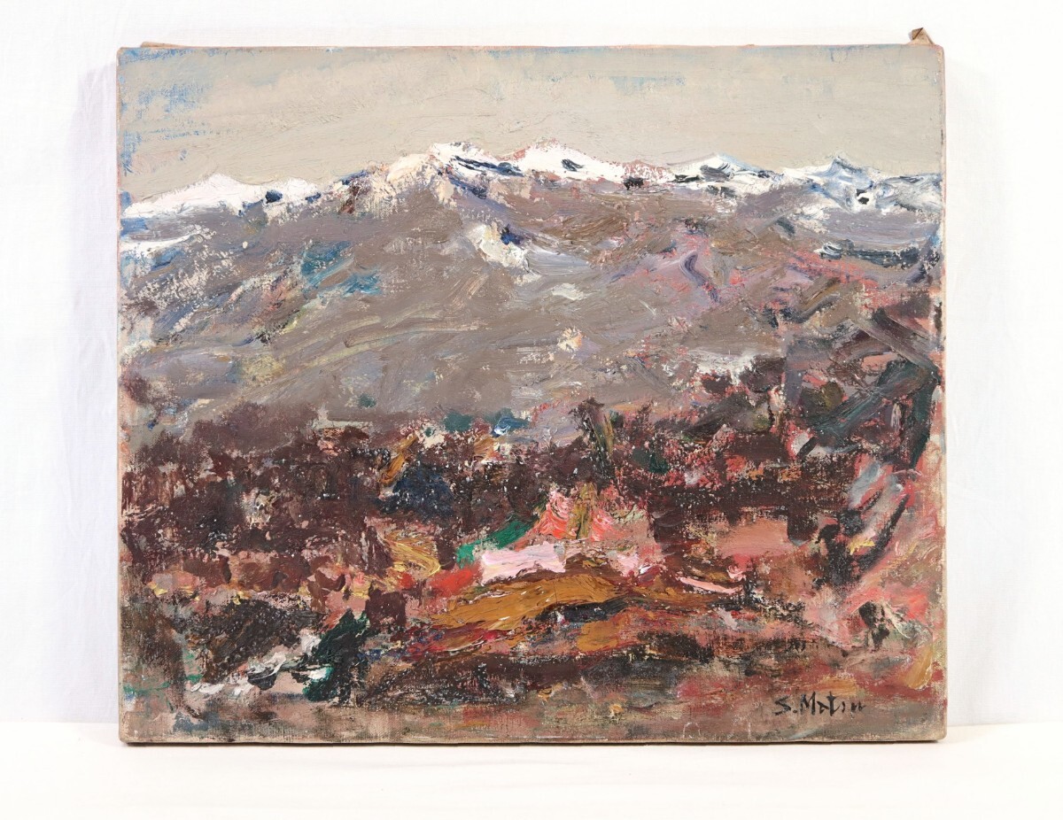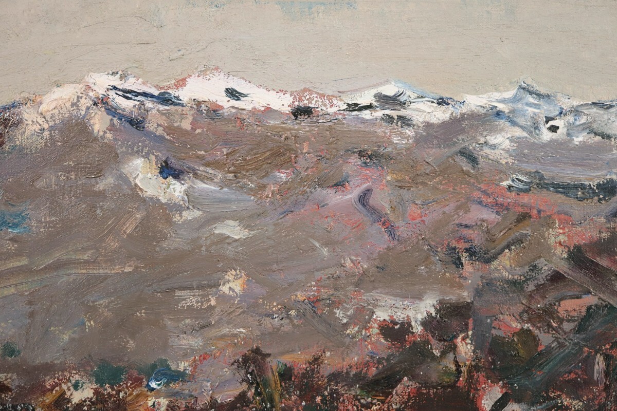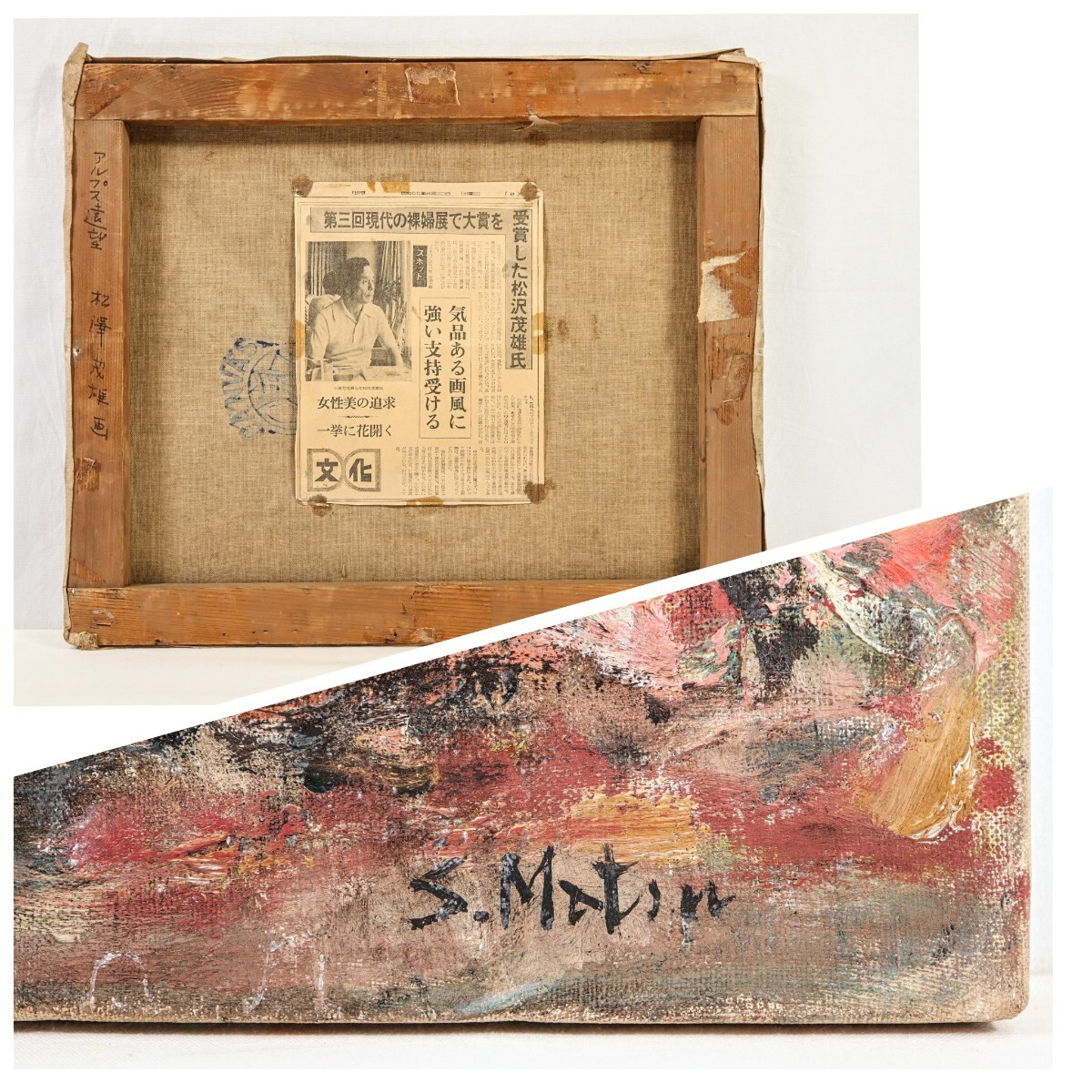 真作 松沢茂雄 油彩「アルプス遠望」画寸F8 千葉県出身 独自の点描画による大作を発表 雪混じりのアルプス連峰と麓の色付く紅葉と集落 8716