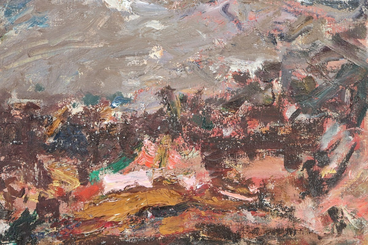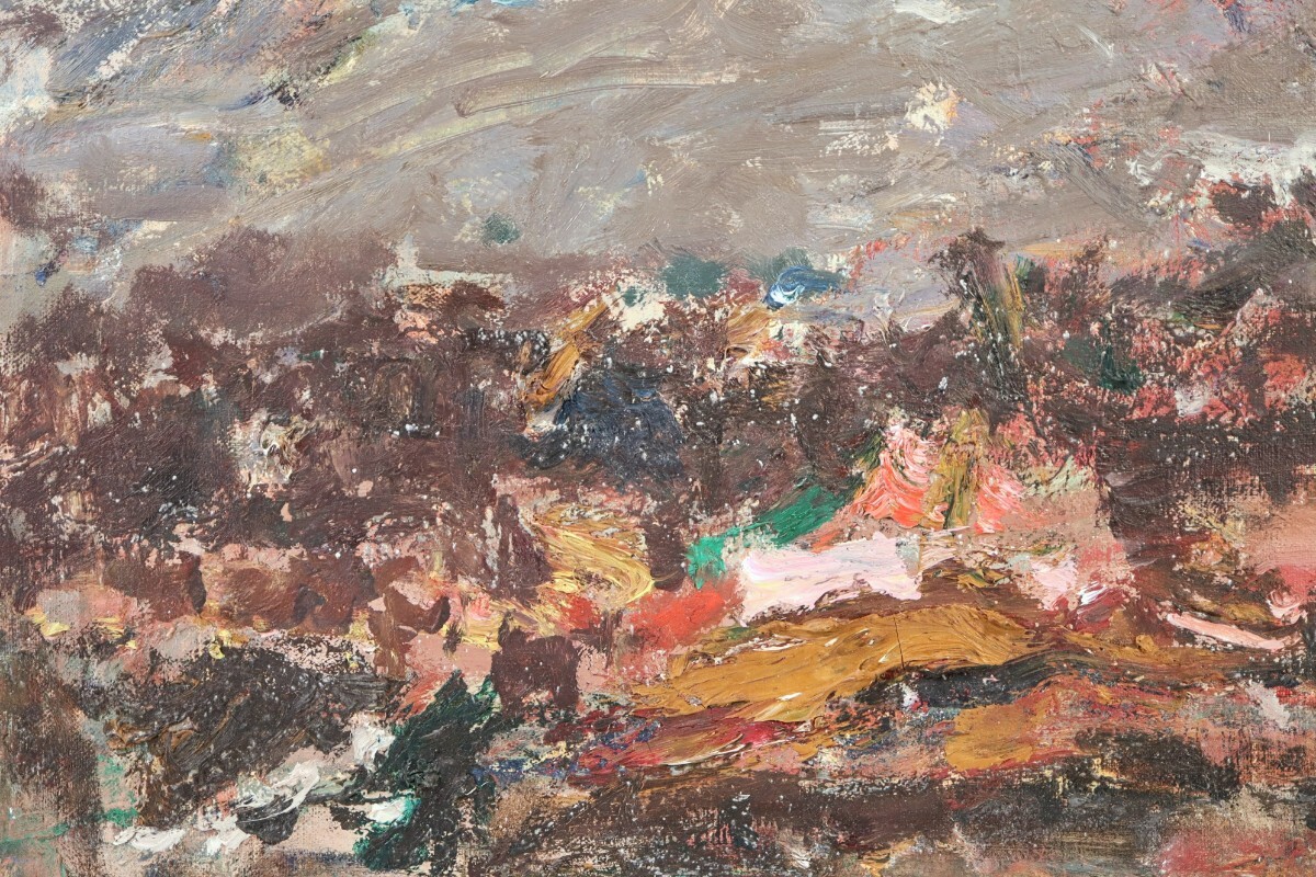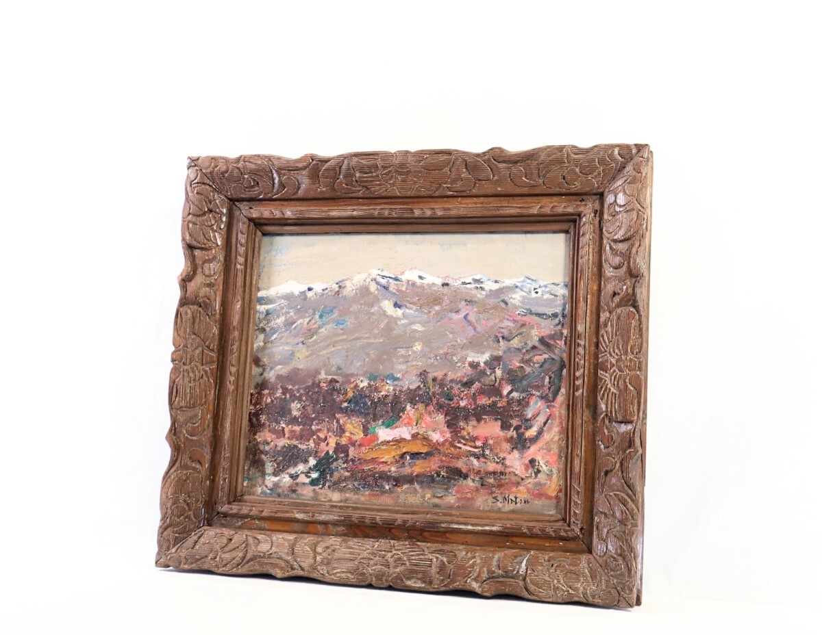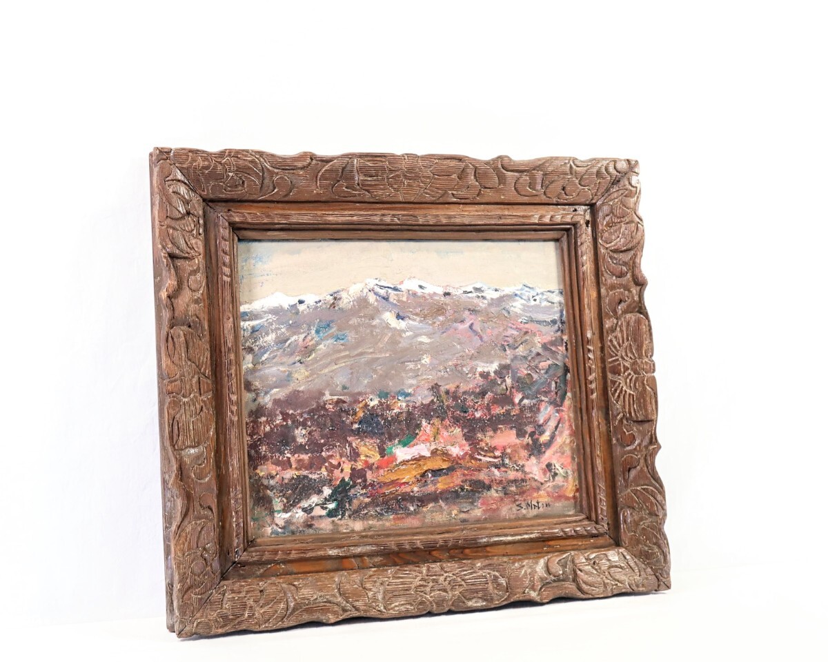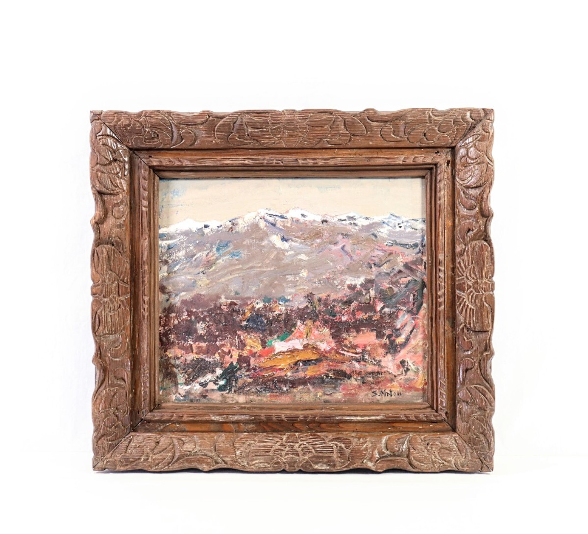 真作 松沢茂雄 油彩「アルプス遠望」画寸F8 千葉県出身 独自の点描画による大作を発表 雪混じりのアルプス連峰と麓の色付く紅葉と集落 8716