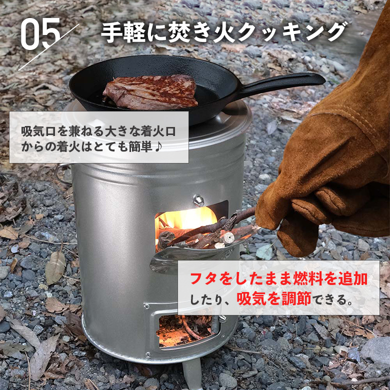 木炭、練炭、薪や枯れ枝などいろいろな燃料が使えて簡単着火!好きな場所で手軽に焚き火クッキングができます。