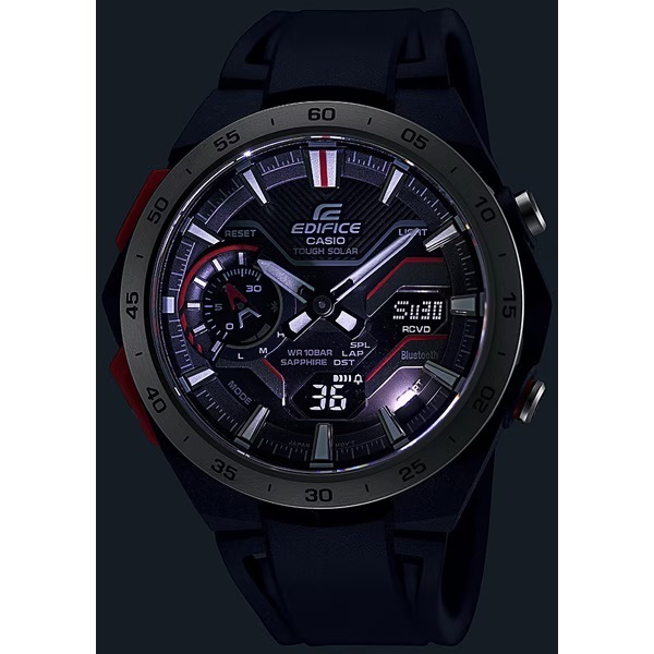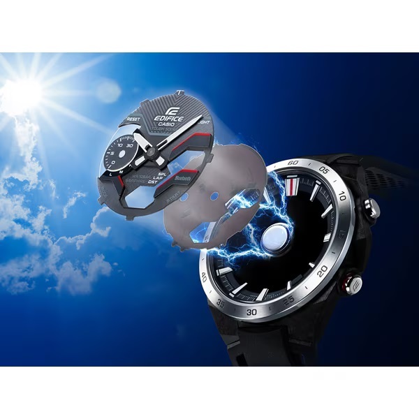 スマートフォンアプリと接続し、自動時刻修正、ワールドタイム、ストップウオッチ計測データの転送、携帯探索機能などを可能にしています。蛍光灯などのわずかな光でも発電するタフソーラーを搭載したサファイアガラスモデルです。
