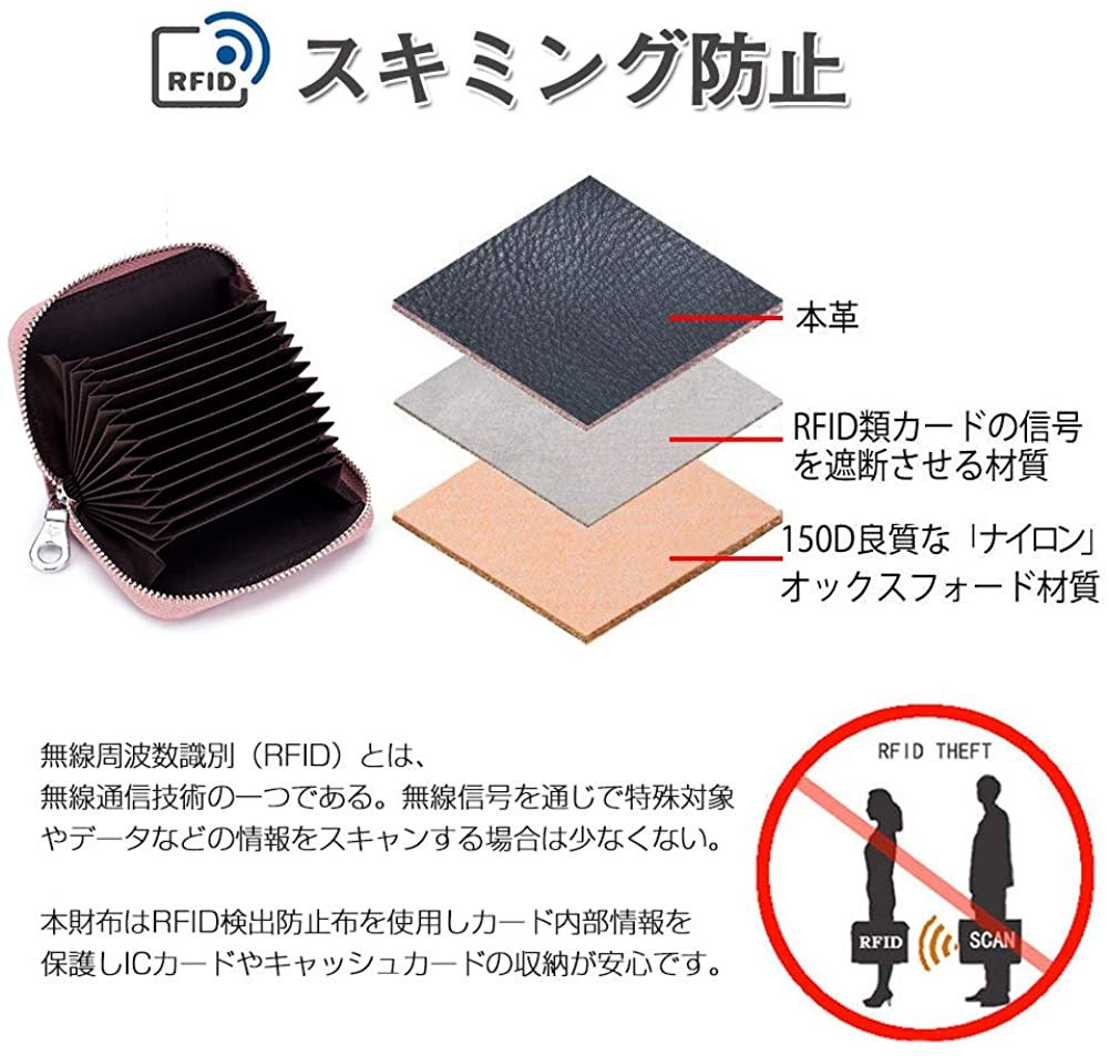 ジャバラ式&スキミング/磁気防止:アコーディオンのように大きく開く蛇腹式で、一目でカードが見やすく取り出しやすい。ファスナーは、特にこだわって製作をしております。スキミング防止フイルムを内蔵しているので、データを取り外しを防ぐことができます。
