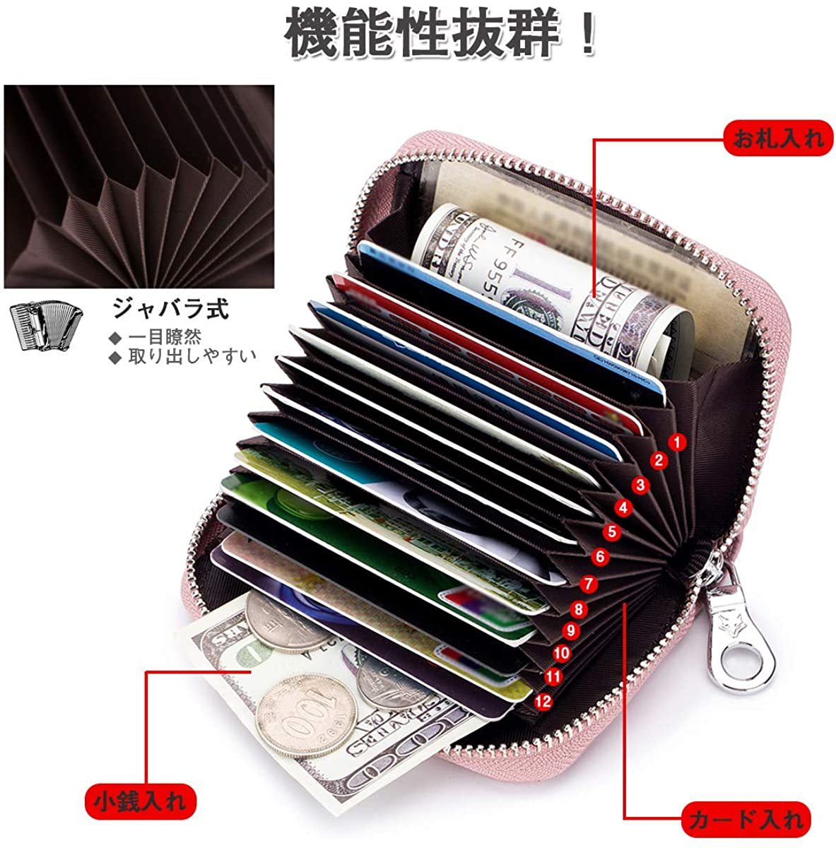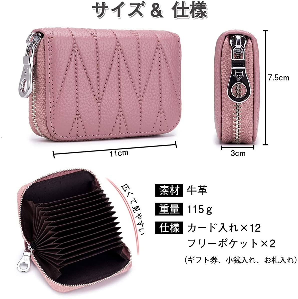 仕様:カード入れ×12 お札入れ×2 ①内側にはポケットが最大24枚収納可能です(1ポケットには2枚収納可能)。②カードの上部がチラ見せになる仕様で、カードへ簡単アクセス。 ③両サイドのポケットにはお札、小銭 、名刺、免許証、定期券、領収書等を収納でき、ちょっとした外出ならこれ一つで十分な収納力を備えている。