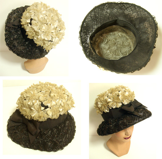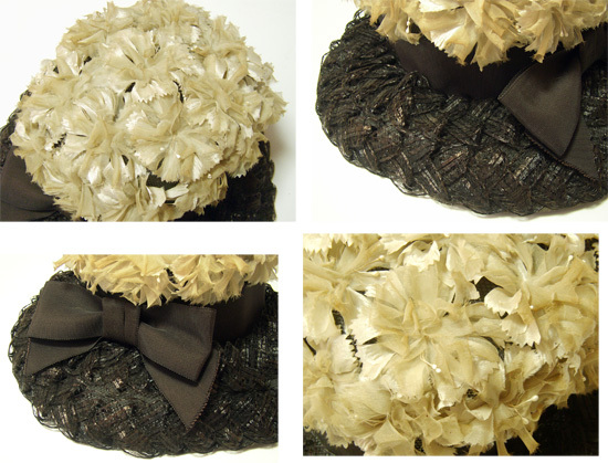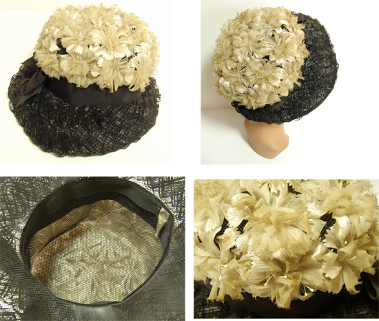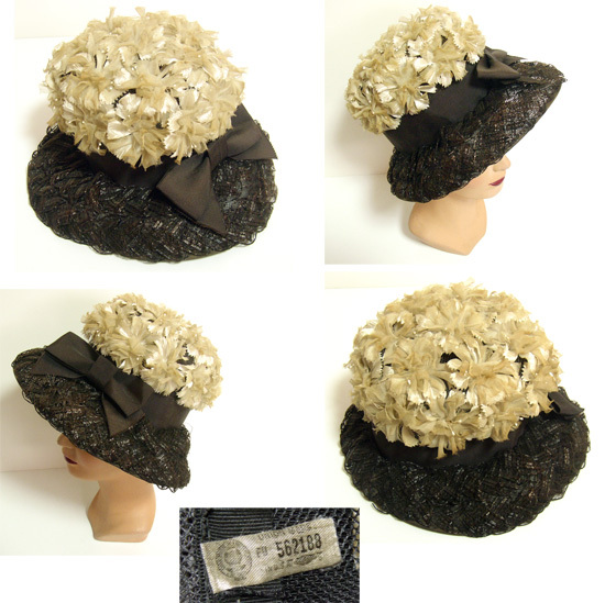 ヴィンテージ レディース ハットです。状態は、古い物ですので、上の白い花の汚れや変色と、リボンやツバなどにも経年による色あせや汚れと色のはげなどありますが(画像4)、ビンテージの雰囲気ある物です。アメリカで購入しました。デザインや作りがとても可愛いです。古い物ですので、状態はそれなりですが、年代物の風格とレトロ感ある物です。高さ 17cm程、つばの最大幅 8cm、内周り 53.5cm程です。ビンテージ物とご理解頂いて、ノークレーム、ノーリターンでお願いします。