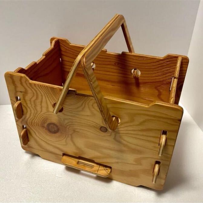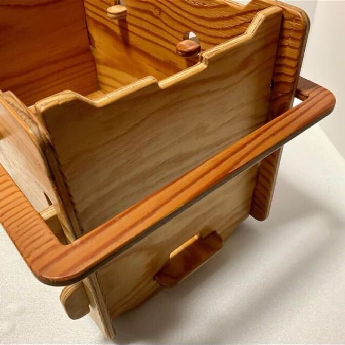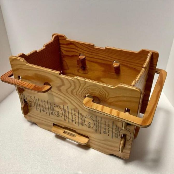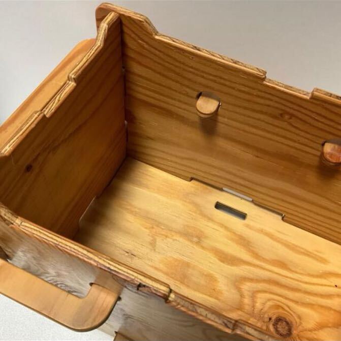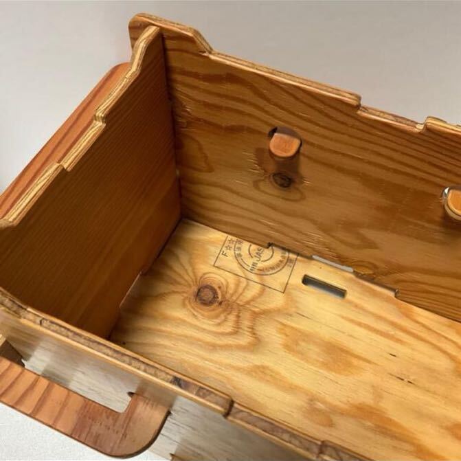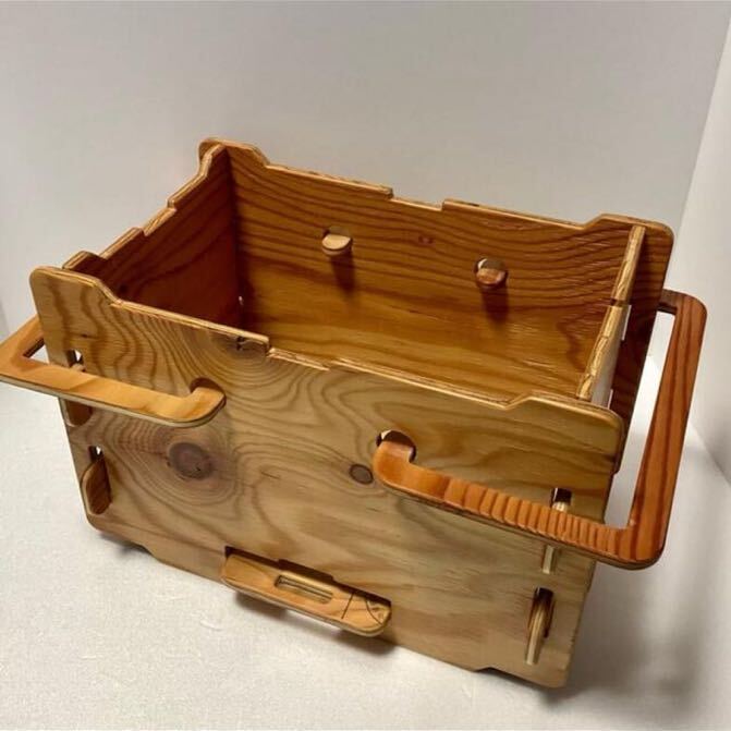 さまざまな道具が無理なく収まる小さめの収納ボックスです。取っ手で持ち運ぶことができ、スタッキングもできます。使わない時は分解し、ベルトでとめてコンパクトにたためます。本体はネジやクギを使わず、完全に木材(合板)だけで出来ていますが、しっかりした作りになっています。