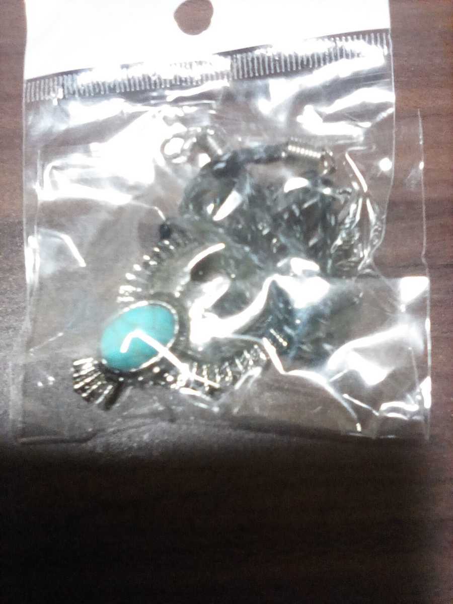 中央に飾ってあるトルコ石(ターコイズ)は、ネイティブ・アメリカン(インディアン)の間では「地球をとりまく美しい空」を表す神の石として、特に神聖視されていました。天や神の力が宿った聖なる石として崇められ、神の声を聞く儀式や、雨乞いなどに用いられたそうです。
