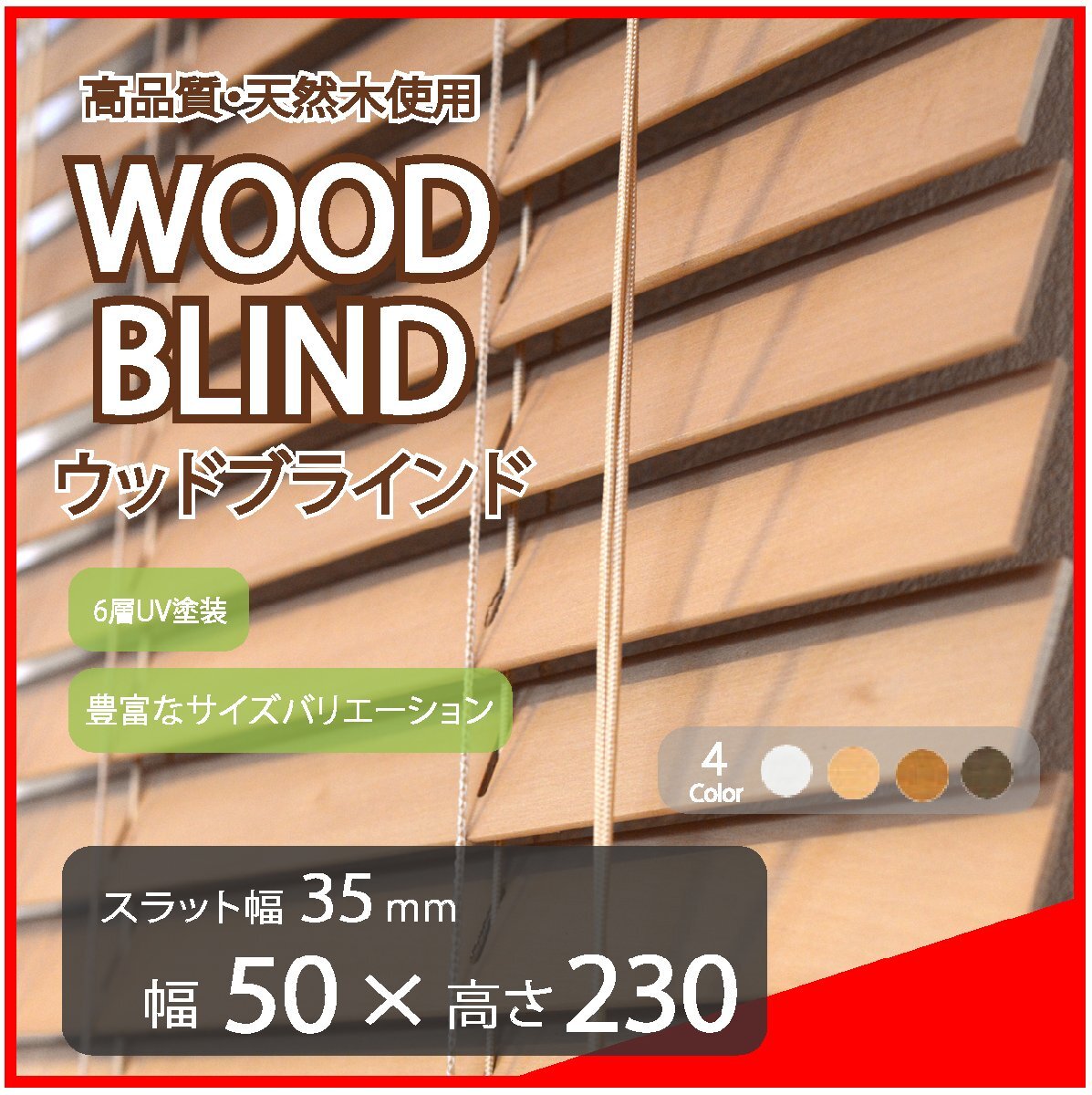 ● 6層UV塗装の高級スラット(羽根) ※1枚無垢のバスウッドスラットに高級家具並みの6層コートを採用しています ● スラット幅(羽根)2種類×68種類のサイズバリエーション×4カラーを取扱いしております ※上記により商品アイテム点数が多い為、常に全てを出品しておりませんので お探しのサイズがございましたら下記の表をご覧頂き、ご質問欄よりお気軽に在庫お問合せ下さい ● 全国一律 1,200 円 ※ 沖縄・離島等で中継料金が発生する場合、別途お見積りとさせて頂きます ● 安心できる1年間の製品保証・サポート付き ※お買求め頂いた商品は、お買上げ日から1年以内に通常範囲内での製品の不具合等に関しまして、 無償にて修理、交換をさせて頂く保証期間を設けさせて頂いております 但し、使用して消耗するスラット・コード類の経年変化による変色や変形等については保証対象外 とさせて頂いております。また使用状況によっては有償となる場合もございます |
