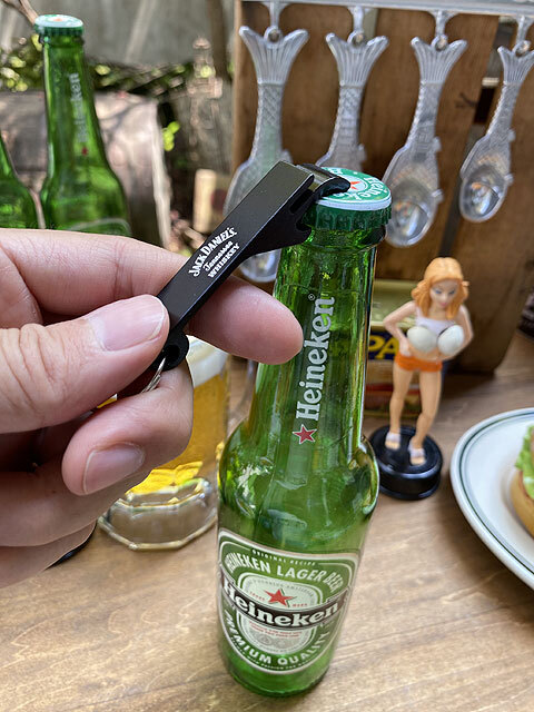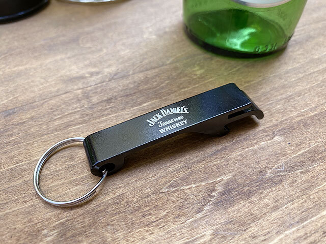 ショットバーで人気のウイスキー、ジャック・ダニエルのロゴ入りオープナーキーホルダーです。