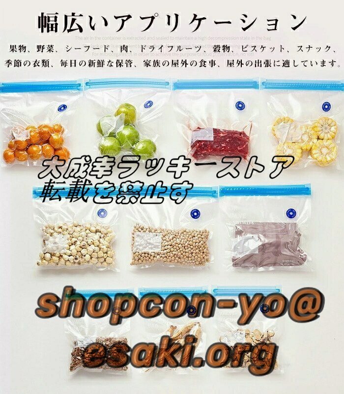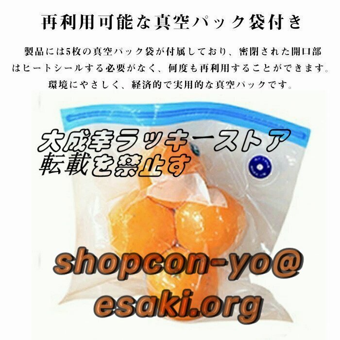 【再利用可能な真空パック袋付き】製品には5枚の真空パック袋が付属しており、密閉された開口部はヒートシールする必要がなく、何度も再利用することができます。環境にやさしく、経済的で実用的な真空パックです。
