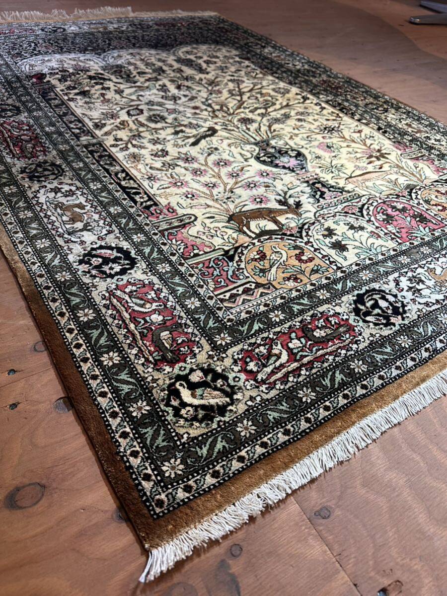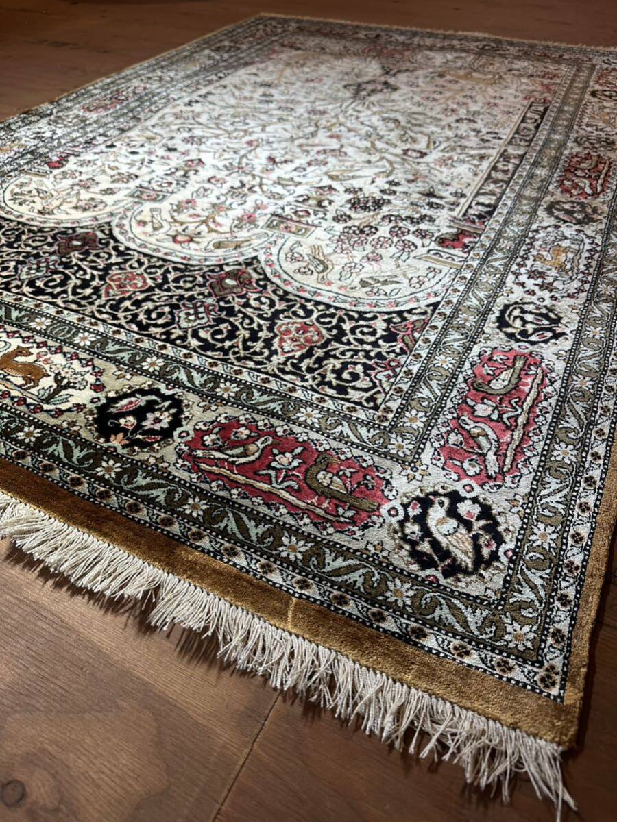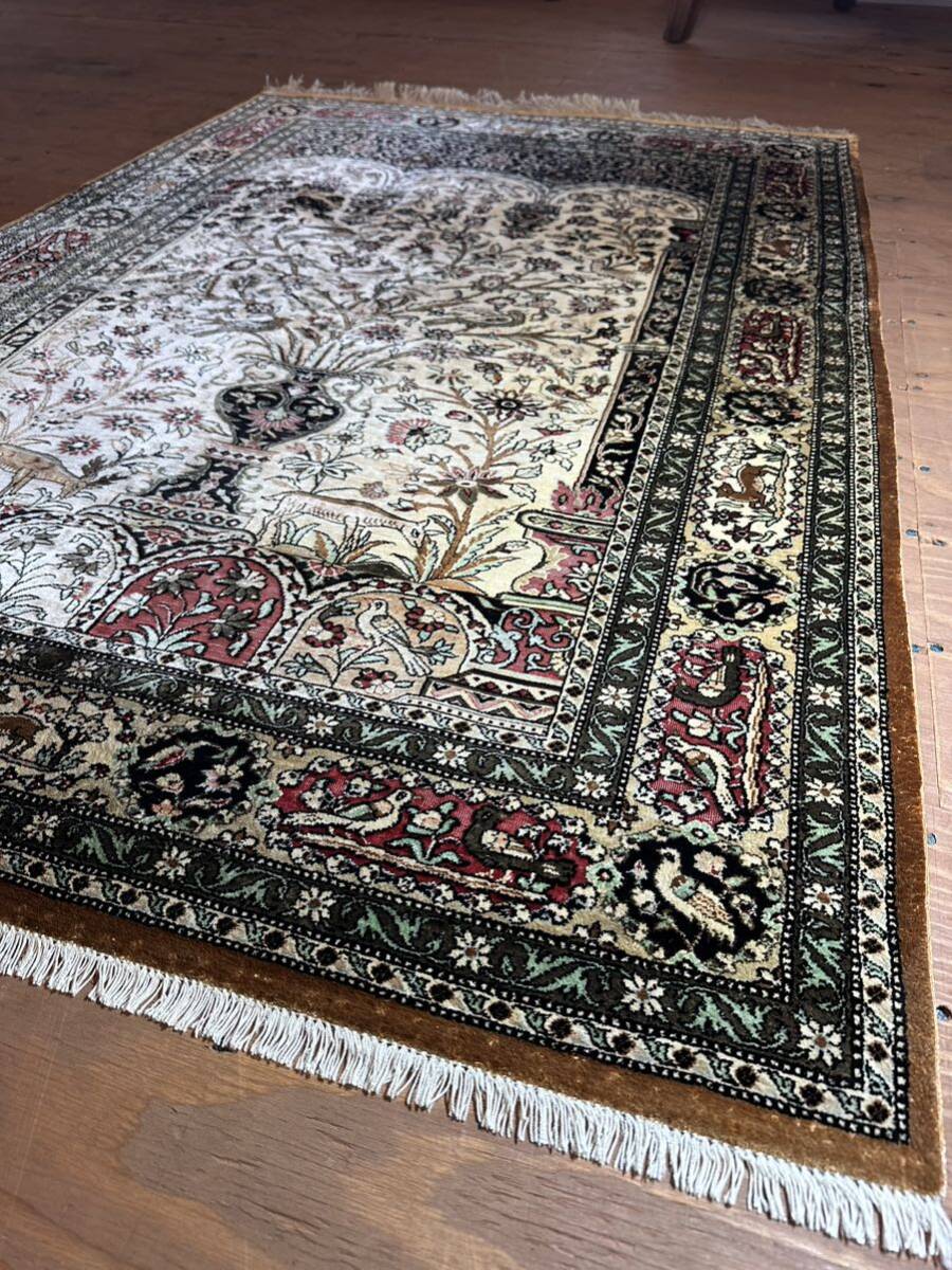 最高級 ペルシャ絨毯 手織り イラン クム産 シルク100% 100万ノット 花鳥鹿花瓶文様 大判 152×102㎝ P152