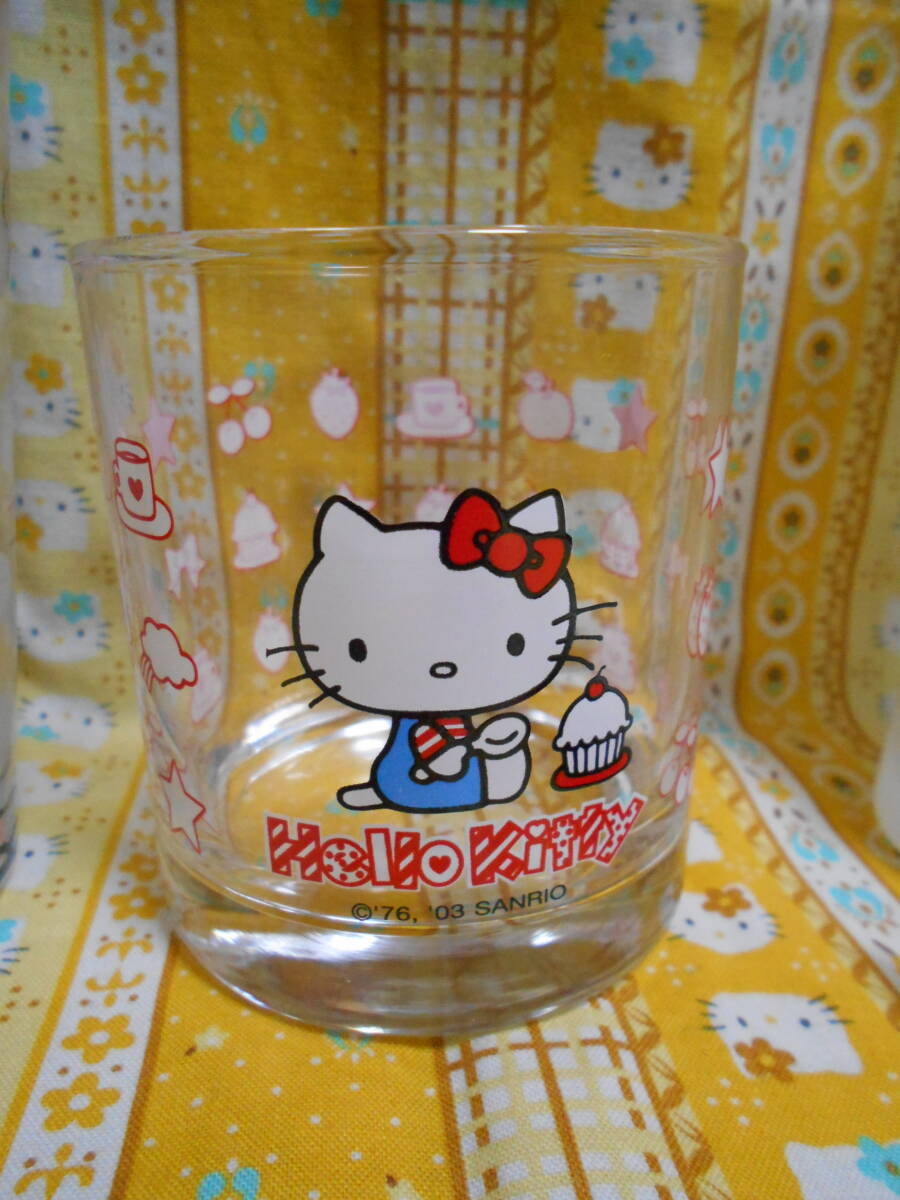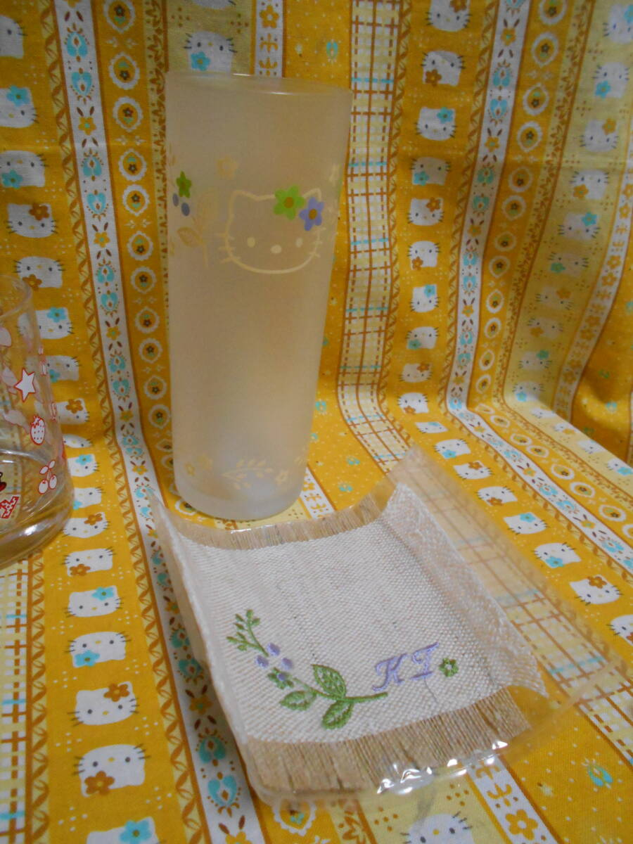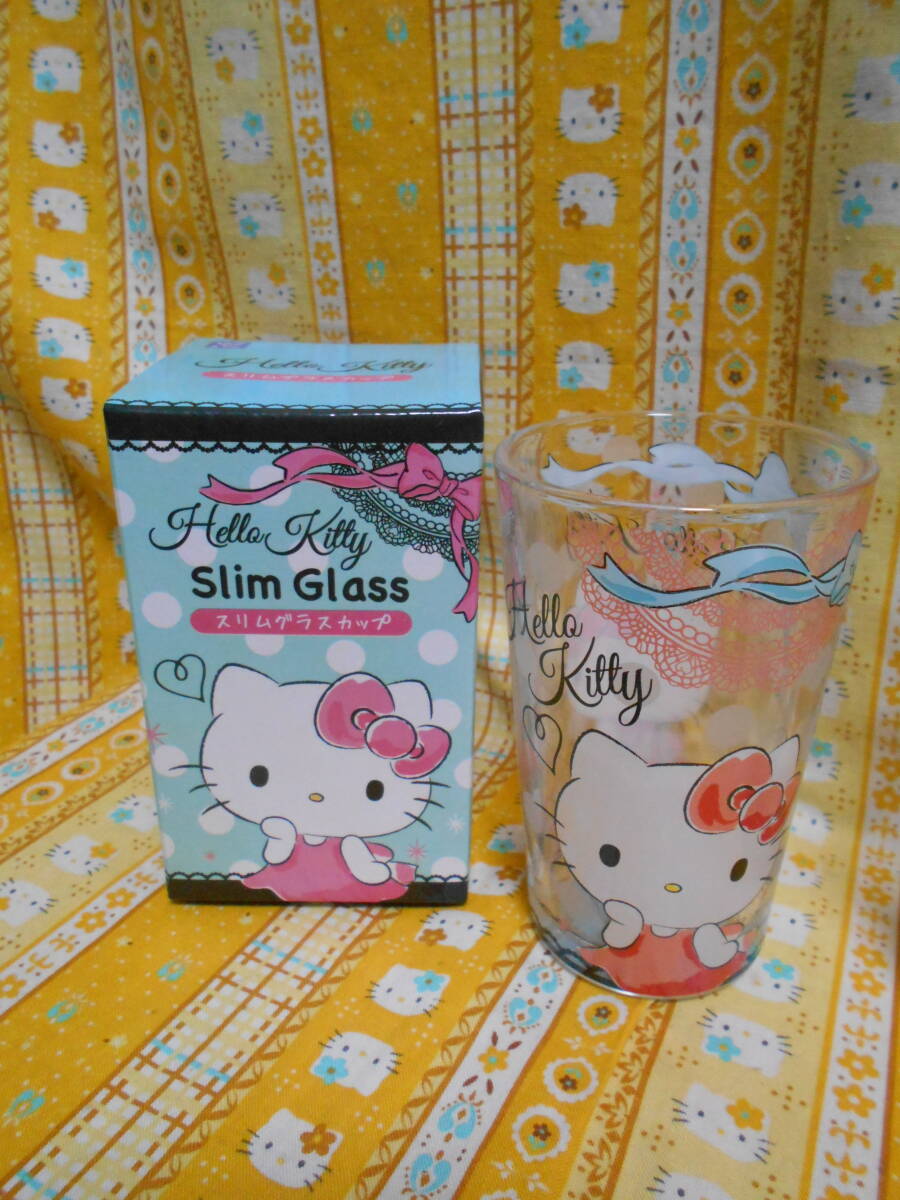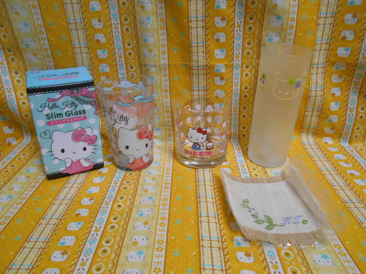 ♪キティ美品サンリオハローキティガラス製グラス3種箱入りスリムグラスカップ2016&レトロ柄2003&布製刺繍コースター付スリムグラス2000