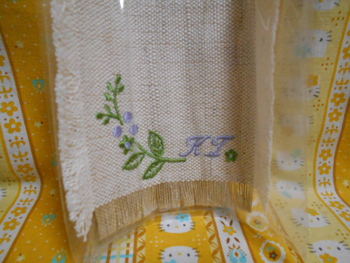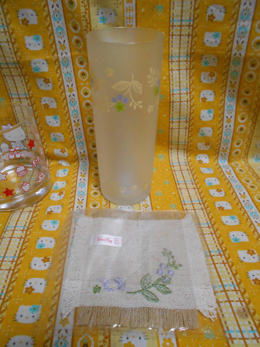 箱入りの左端のお品が上部の直径6.8cm、高さ11cm、低めのお品が上部の直径7cm、高さ8cm、スリムなグラスが上部の直径5.5cm、高さ15cmほどのお品です。布製コースターはきれいな刺繍入りです。真ん中のお品だけ底面裏にキズがあります。