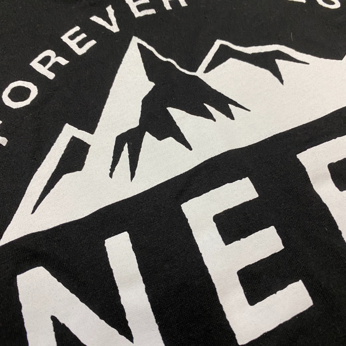 ・壮大な山脈とブランドロゴが印象的なグラフィックTシャツ