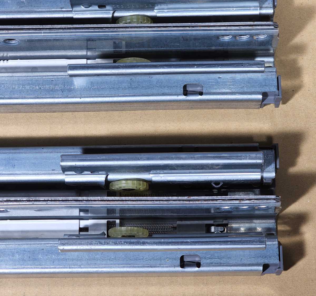 システムキッチン等の引き出しに採用されているびっくりするほど動きのスムーズなスライドレールです。引き出しの底に取り付けるタイプです。脱着可能・片トラベル、持ち上げてローラーを乗り越えさせると引き抜くことが出来ます。