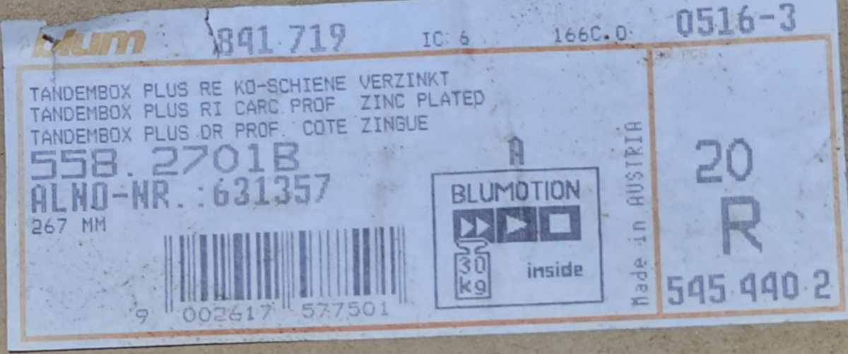 Blum 558.2701B/578.2701B TANDEMBOX BLUMOTION 引き出しスライド - 270 mm - 11 インチ - 30 kg