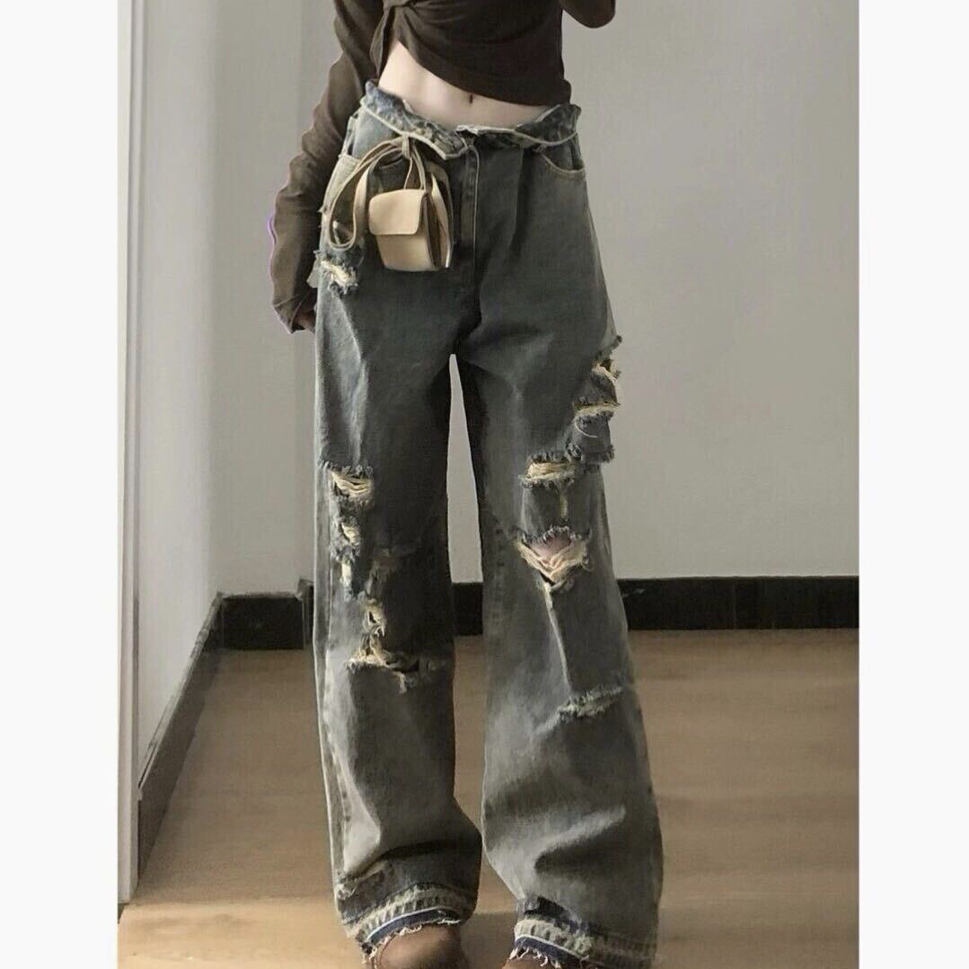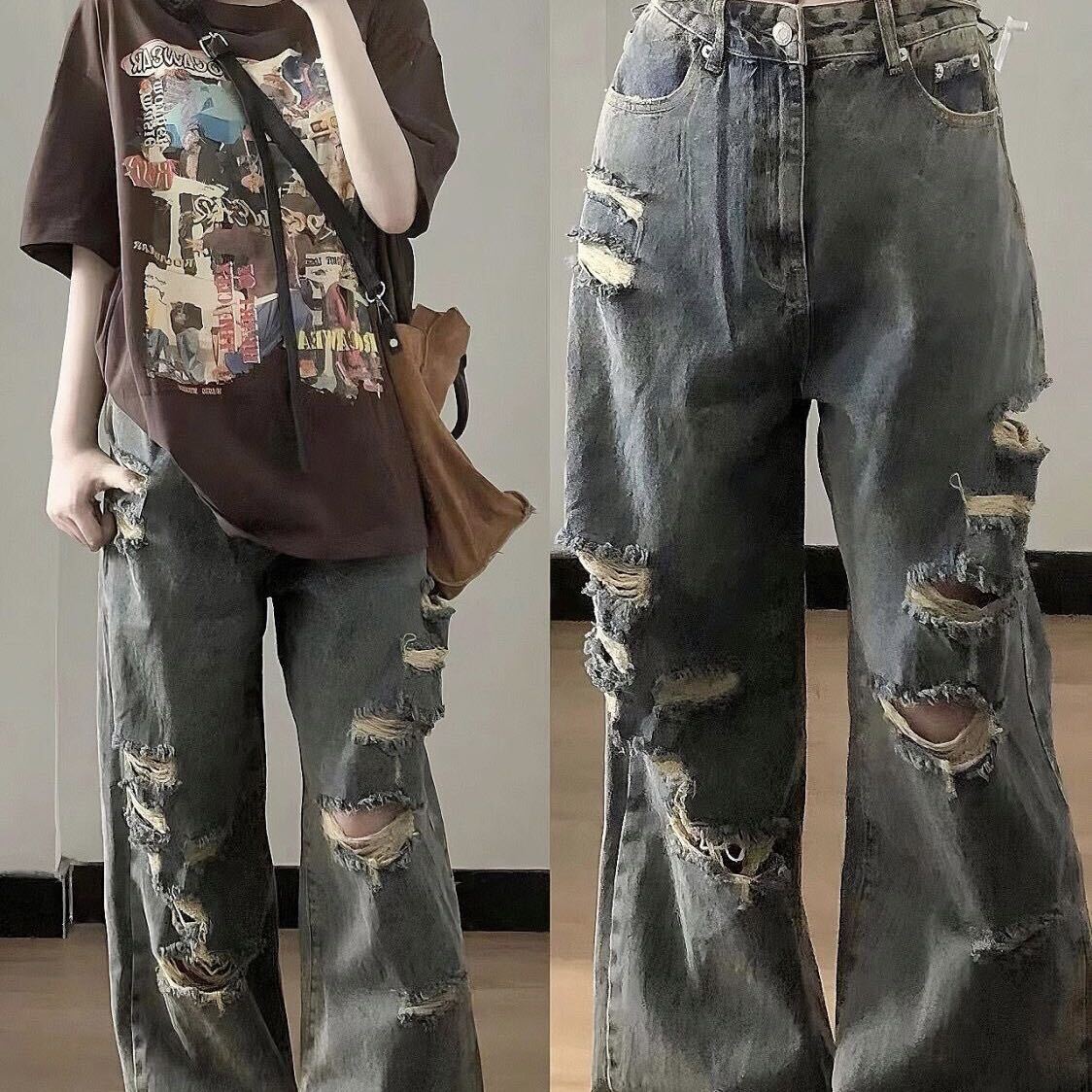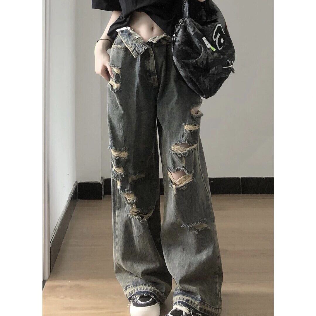 デニムパンツ レディース ダメージ加工 ジーンズ ワイドパンツ ロングパンツ ボトムス ハイウエスト 美脚 可愛い ヒップホップ ゆったり 楽ちん きれいめ カジュアル オシャレ 脚長 かわいい 春 夏 秋 冬 韓国ファッション SLTC027(S-2XL)