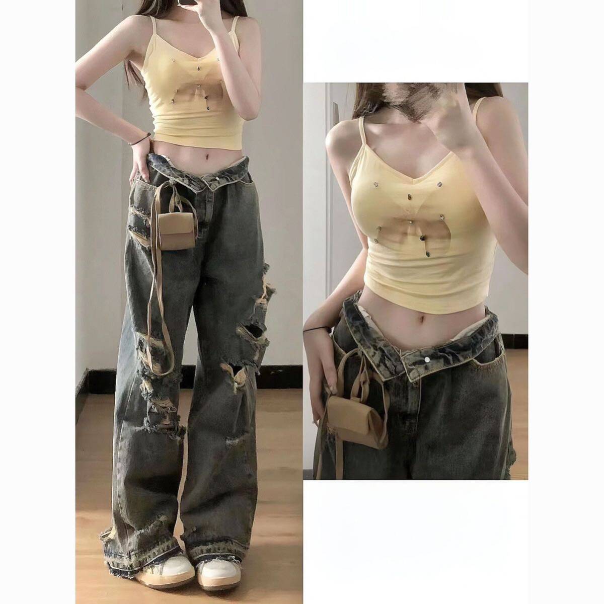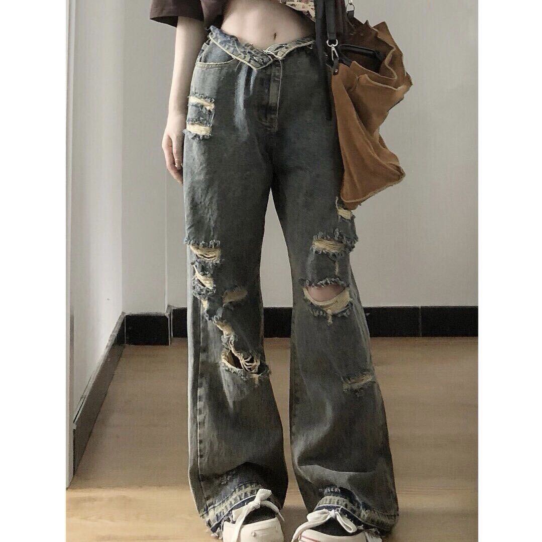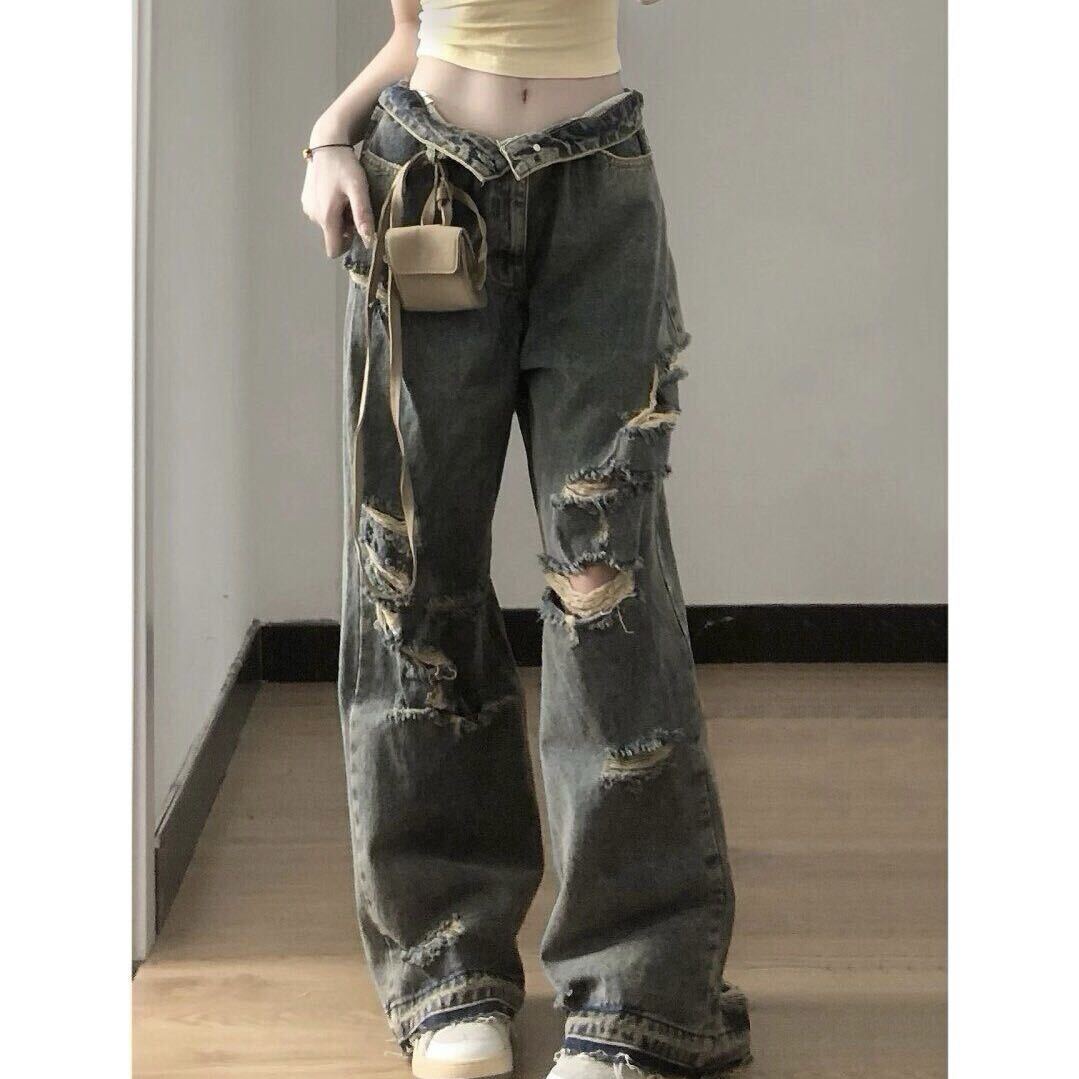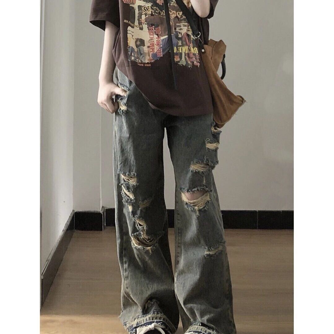 デニムパンツ レディース ダメージ加工 ジーンズ ワイドパンツ ロングパンツ ボトムス ハイウエスト 美脚 可愛い ヒップホップ ゆったり 楽ちん きれいめ カジュアル オシャレ 脚長 かわいい 春 夏 秋 冬 韓国ファッション SLTC027(S-2XL)