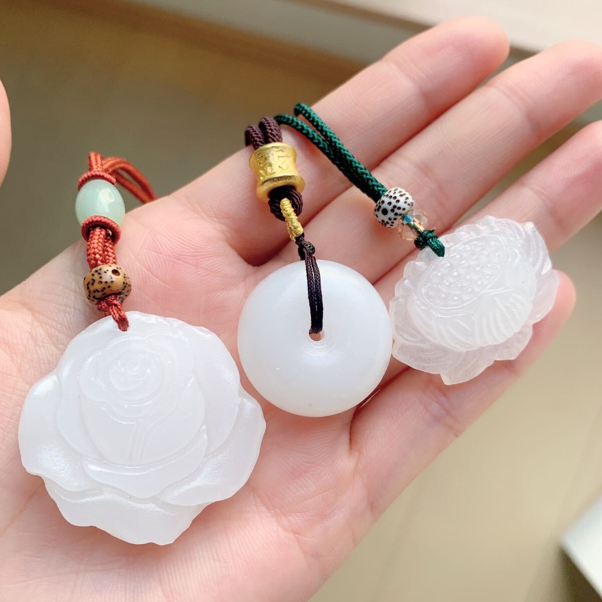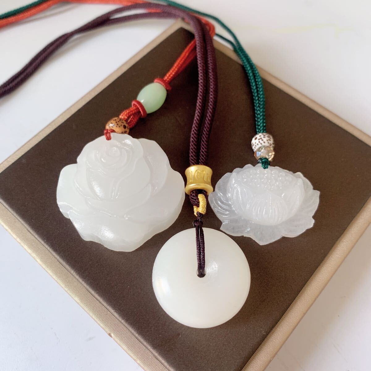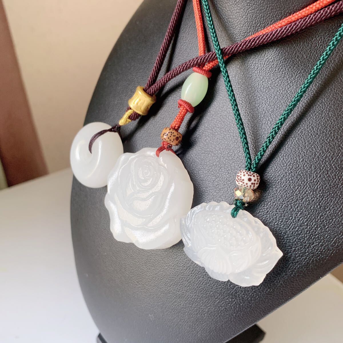 3点セット◇アフガニスタン・白玉◇翡翠・ヒスイ◇天然石◇ネックレス◇ペンダント◇蓮花・ドーナツ・バラ形◇巾着袋付き◇プレゼントにも