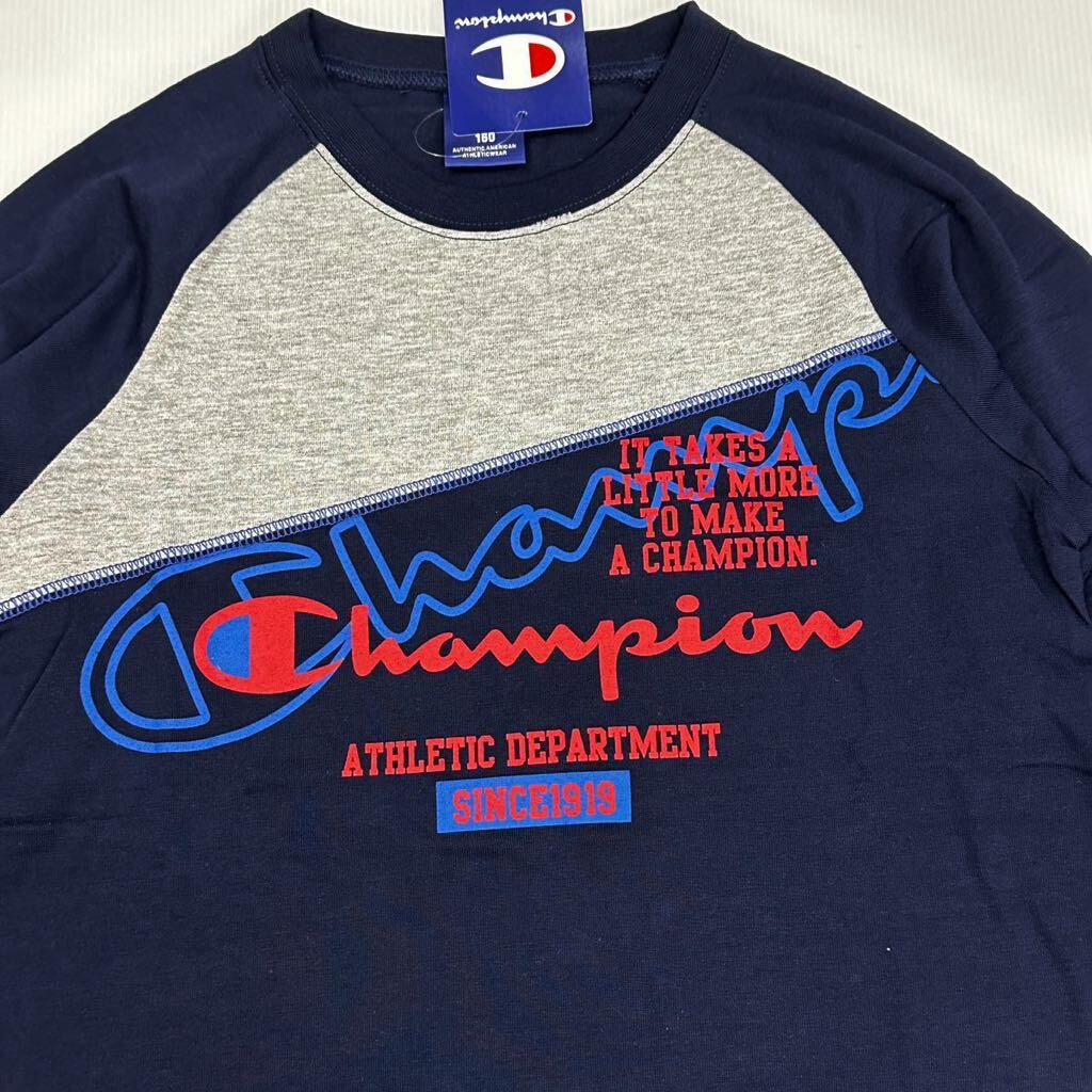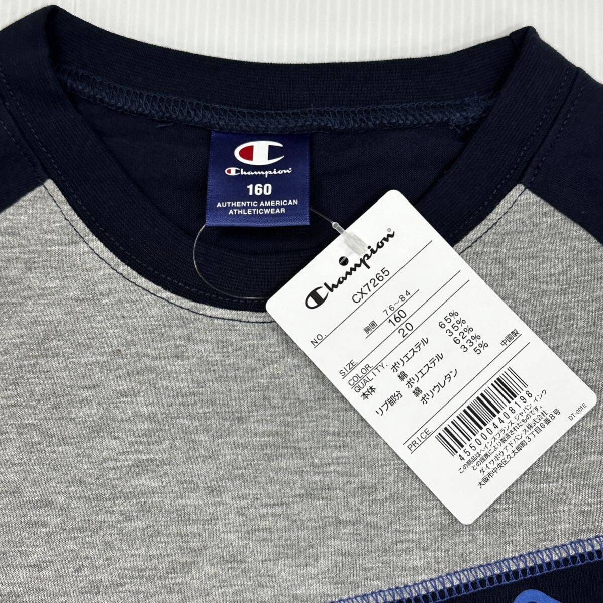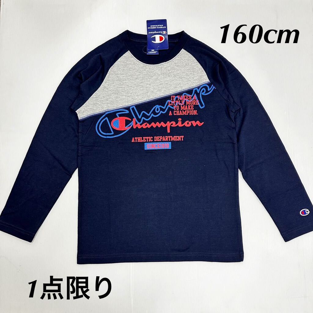 新品18647 Championチャンピオン160cm 紺ネイビー グレー配色 長袖Tシャツ 胸プリントロゴ丸首Tシャツ オールシーズンキッズジュニア ロンT