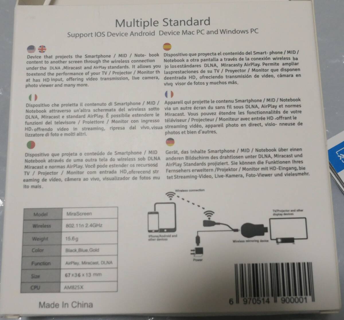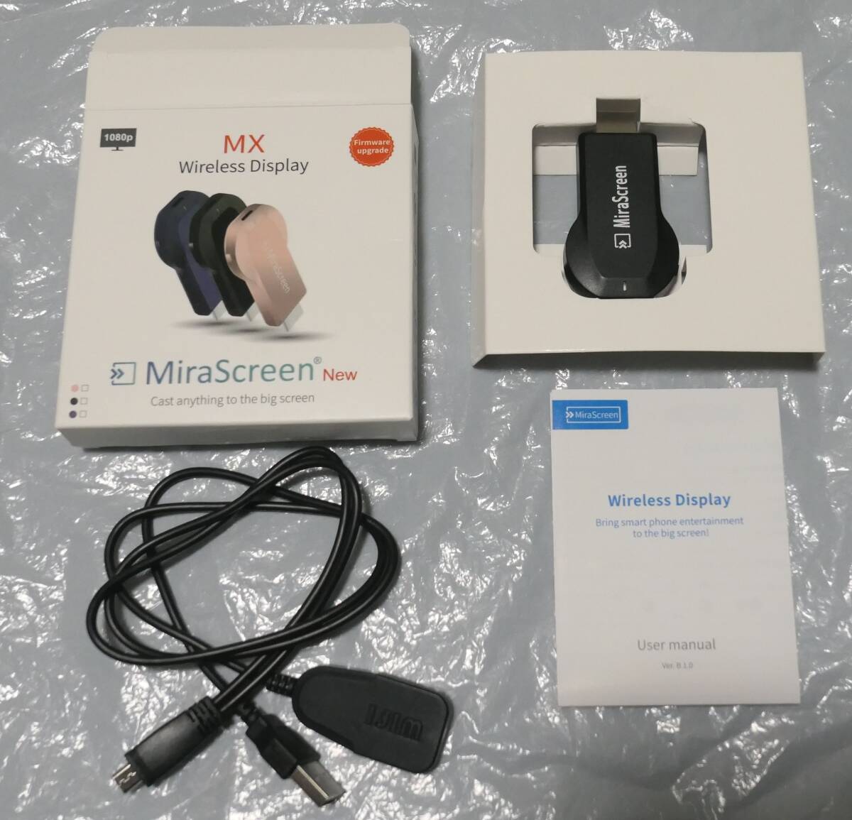 この商品は、モニター等にワイヤレス接続して画像を投影するキットです。僅かに画像のラグはありますが、便利です。接続は取り扱い説明書が少しわかりにくいので、ネットやYouTube等で調べたほうが早いかもしれません。この商品をお求めの方には、大変状態の良い商品ですので、自信を持ってお勧めする商品ですが、発見できないような商品差や、初期の状態によっては傷に見える部分等もあるかもしれませんので、十分ご検討いただき、NC&NRでお願いいただき、微細な状態を気にされる方はご遠慮下さい。