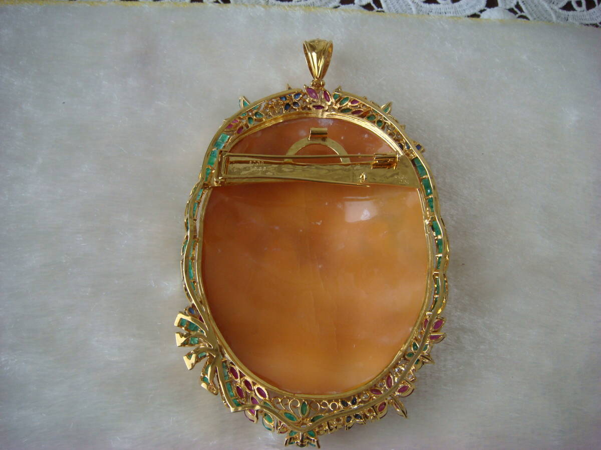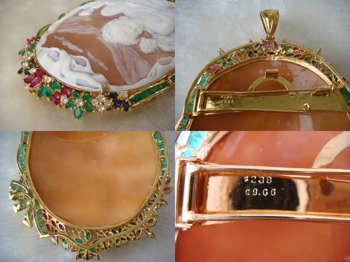 特大の宝石 シェルカメオです。ブローチ&ペンダントです。18金製です。750の刻印入り。