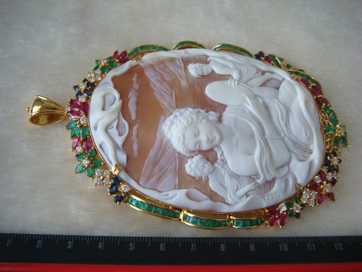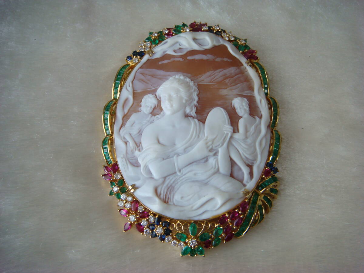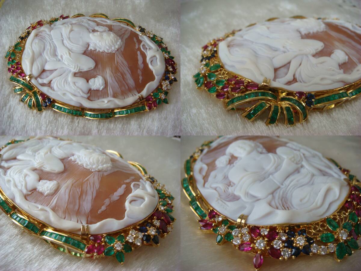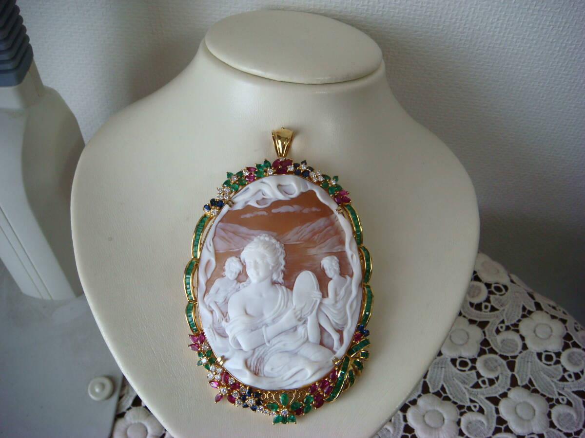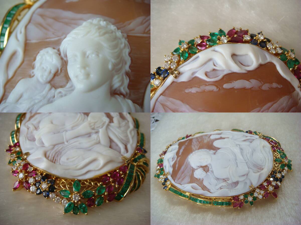 これだけ宝石で飾られたシェルカメオは珍しいです。
