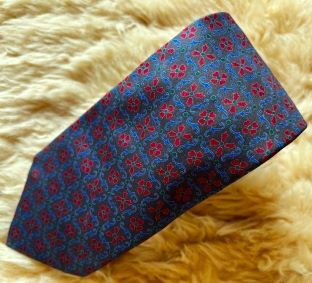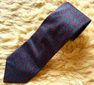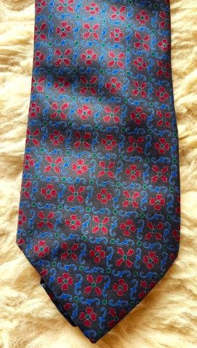 ●ブルーグレー色地にブルー色の唐草格子とその中に赤色花柄プリントしたシックなネクタイです
