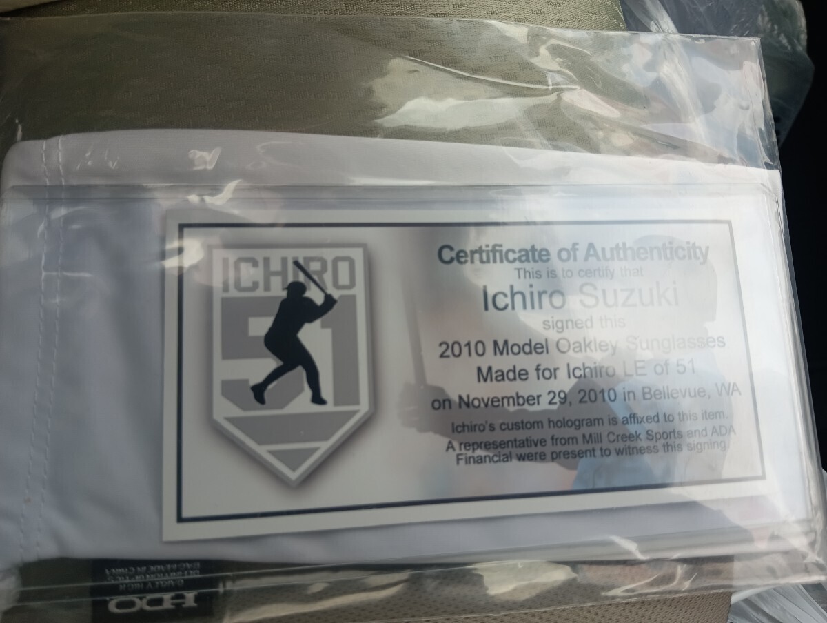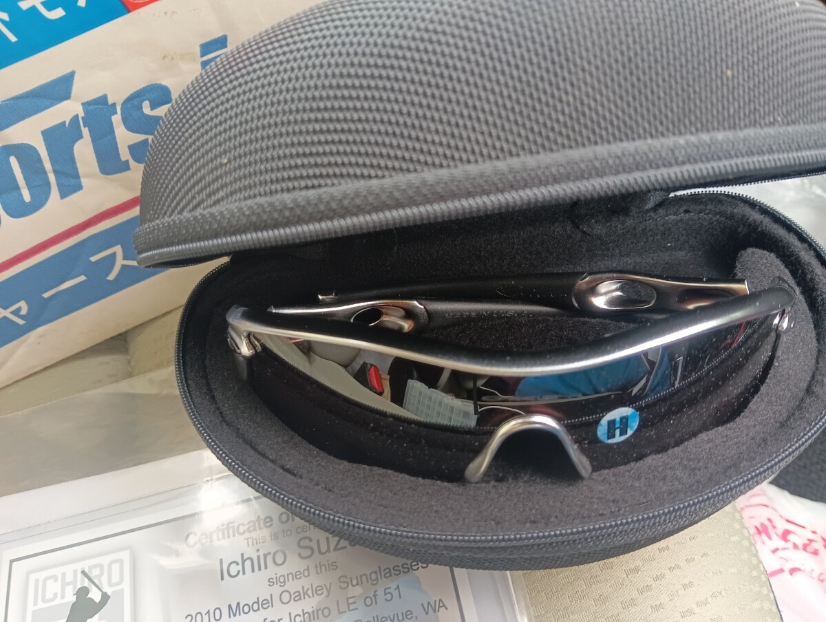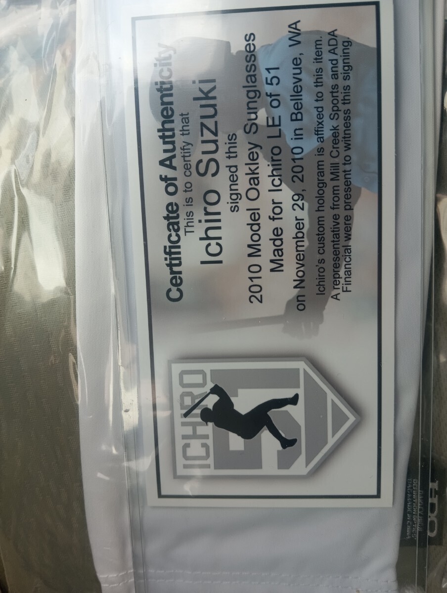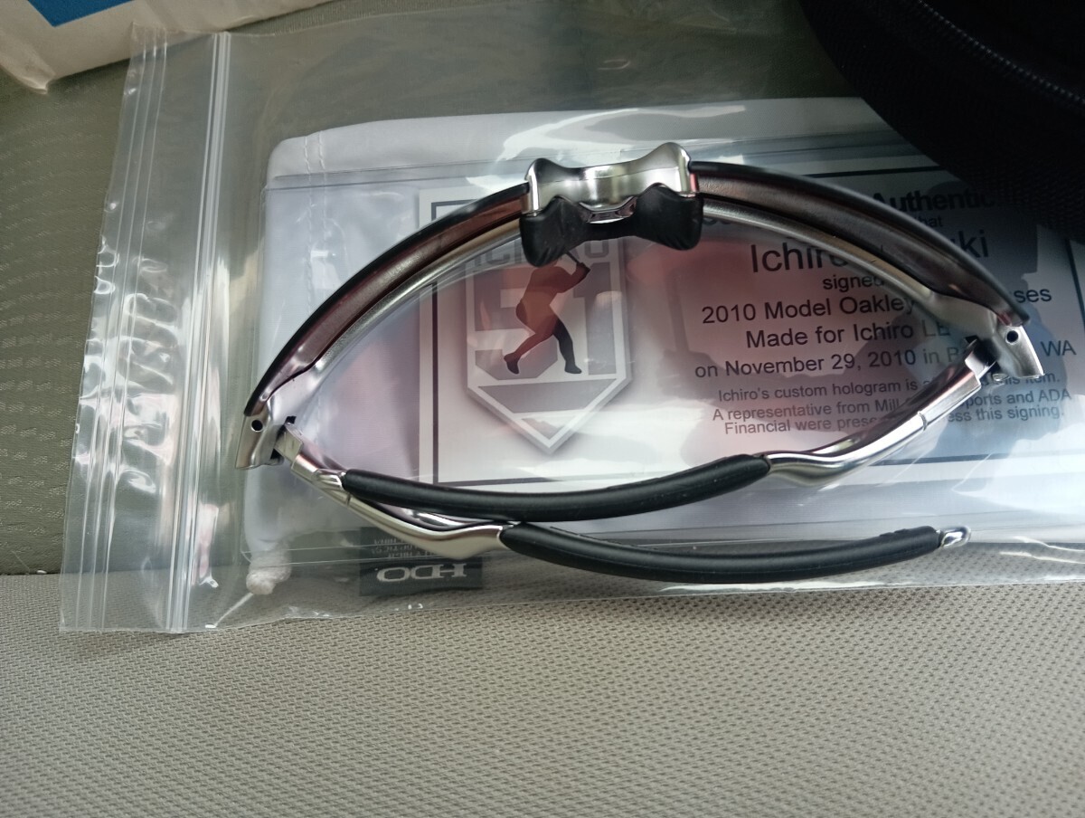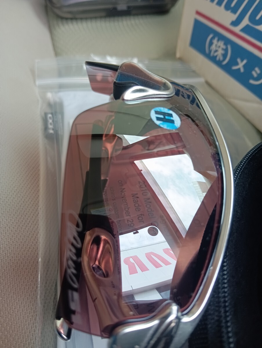 ご覧頂きありがとうございます。メジャースポーツ限定、オークリーレーダーのイチローモデル世界限定51本未使用です。イチロー氏がメジャー10年連続200安打を記念して限定販売されたモデルです。イチロー氏のサイン入りソフトケース。サイン証明書とフォログラムシール入りです。レンズはストレートイリジウムフレームはシルバーメッキ風です。このイチローモデルはレンズに曇り止めのスリットカットが有りません。メジャースポーツさんは多くのメジャーリーガーの限定品を扱っています。シリアルナンバーは11/51です。神戸でイチロー氏がこのシリアルナンバーを拝見されて、うーん残念!まあ10年の区切りやねってコメント頂きました。新品未使用ですが年数経過の品物です。神経質な方と完璧を求める方はご入札をご遠慮下さい。新規の方と評価が悪い方はご入札を削除させて頂く場合がございます。ノンクレーム、ノンリターンでよろしくお願いします。