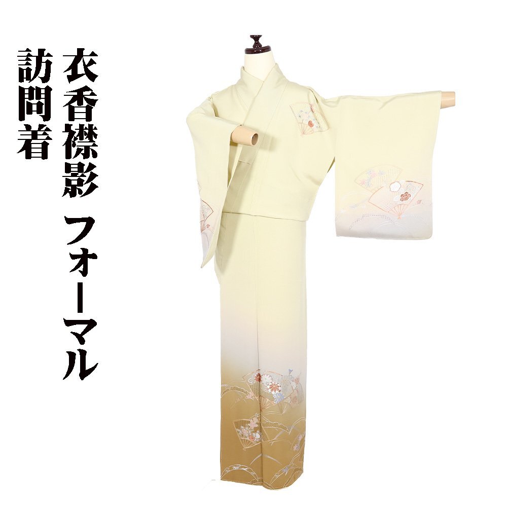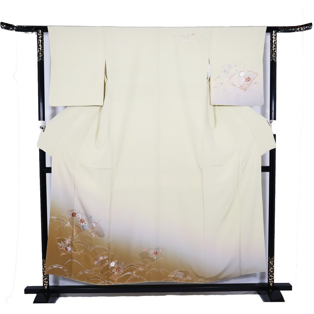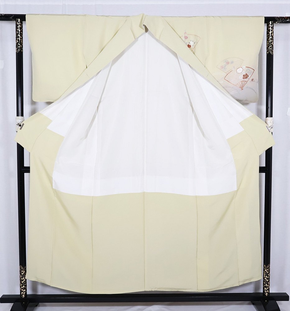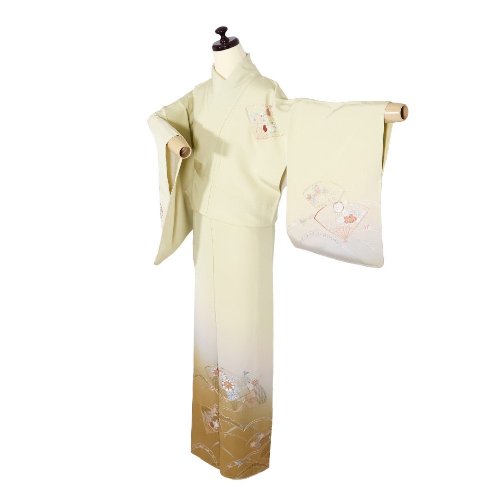 | 訪問着 袷 丹後縮緬地 黄緑・ピンク・茶色暈し地 総刺繍・花扇子 ドロンワーク刺 菊・梅・橘・椿・紅葉 160 広襟 新品 仕付け付き | |