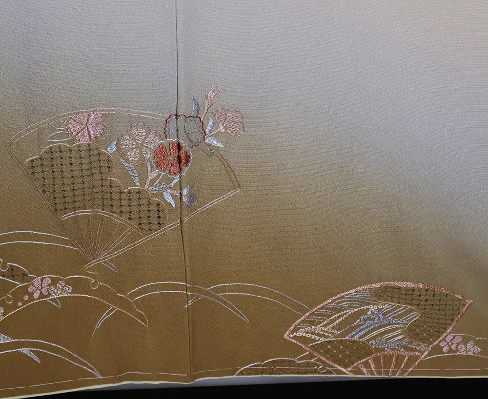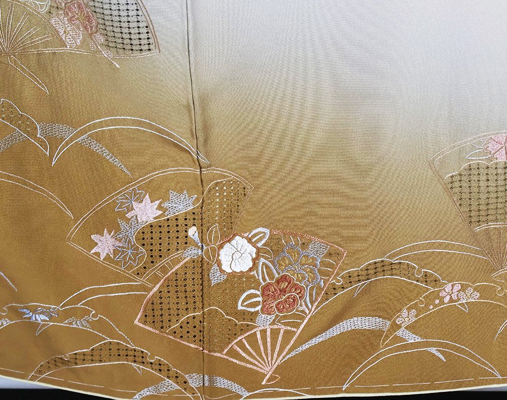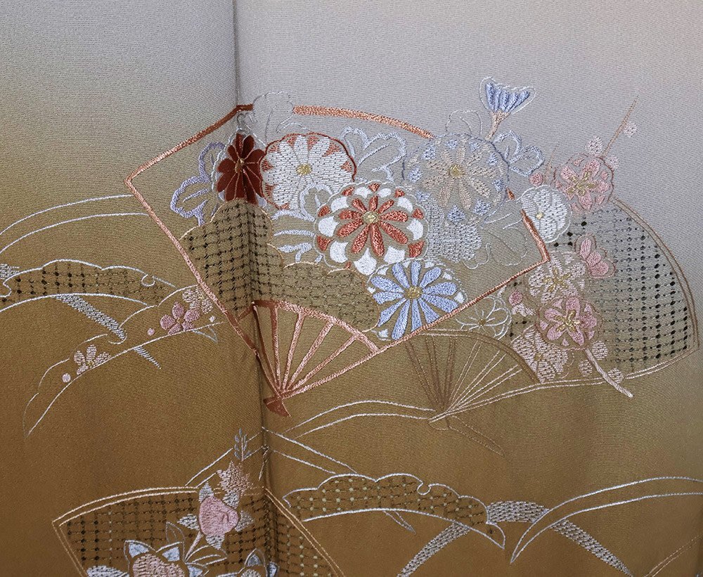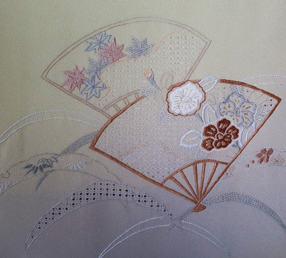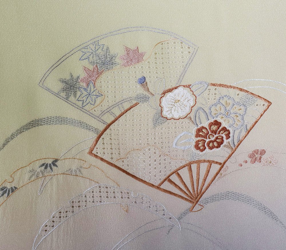 | 色・柄 | 訪問着 袷 丹後縮緬地 黄緑・ピンク・茶色暈し地 総刺繍・花扇子 ドロンワーク刺 菊・梅・橘・椿・紅葉 (写真では上手く色が出ない場合があります。ご了承下さい) |
