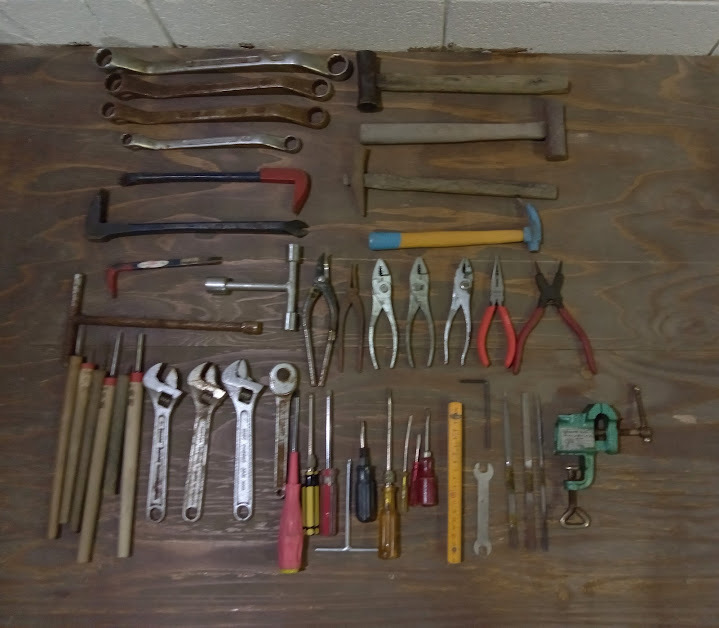 ▽ 工具 46点 まとめ / 玄翁 ハンマー 千枚通し メガネレンチ モンキーレンチ スナップリングプライヤー ベンチバイス バール DIY 大工道具