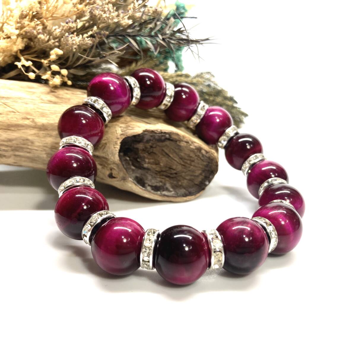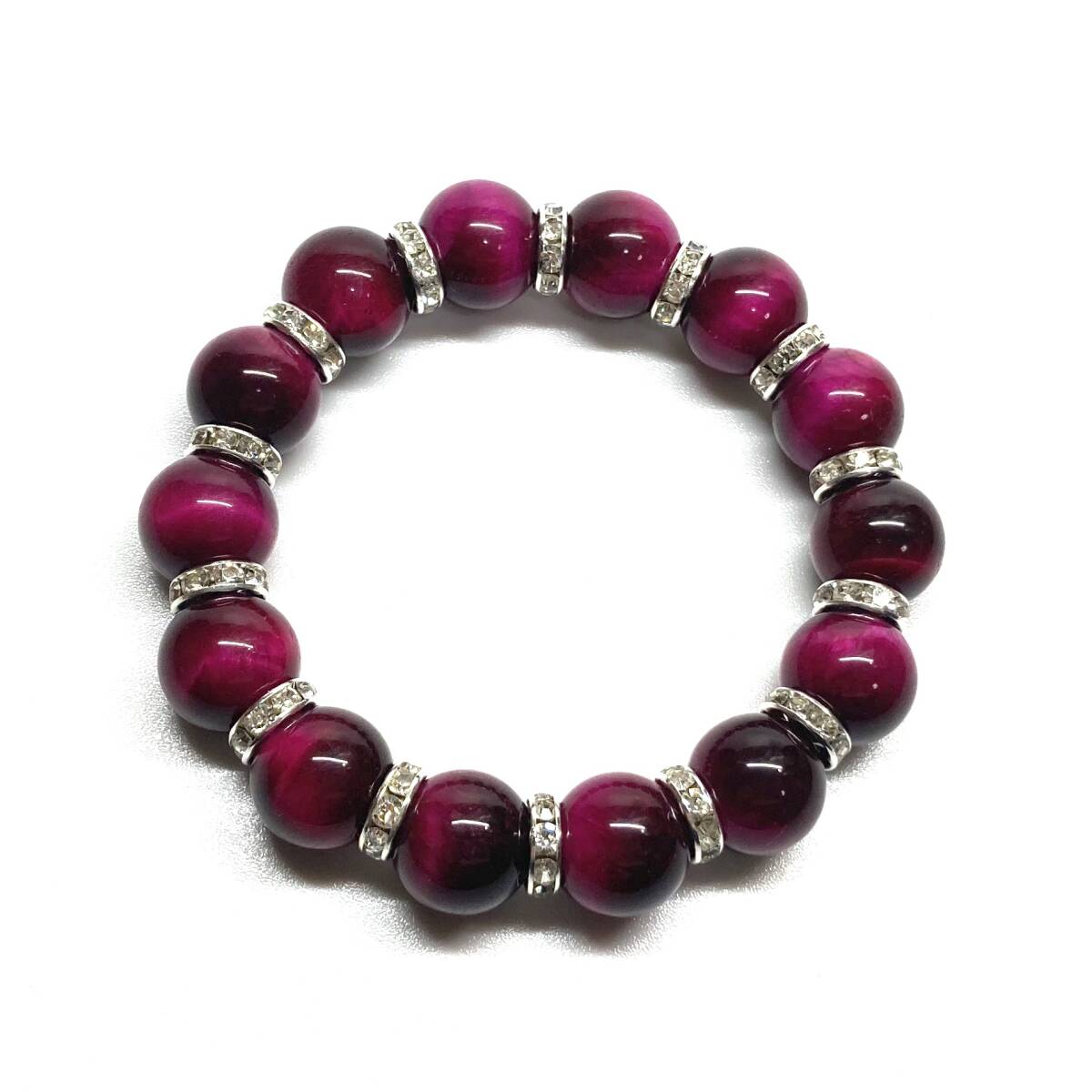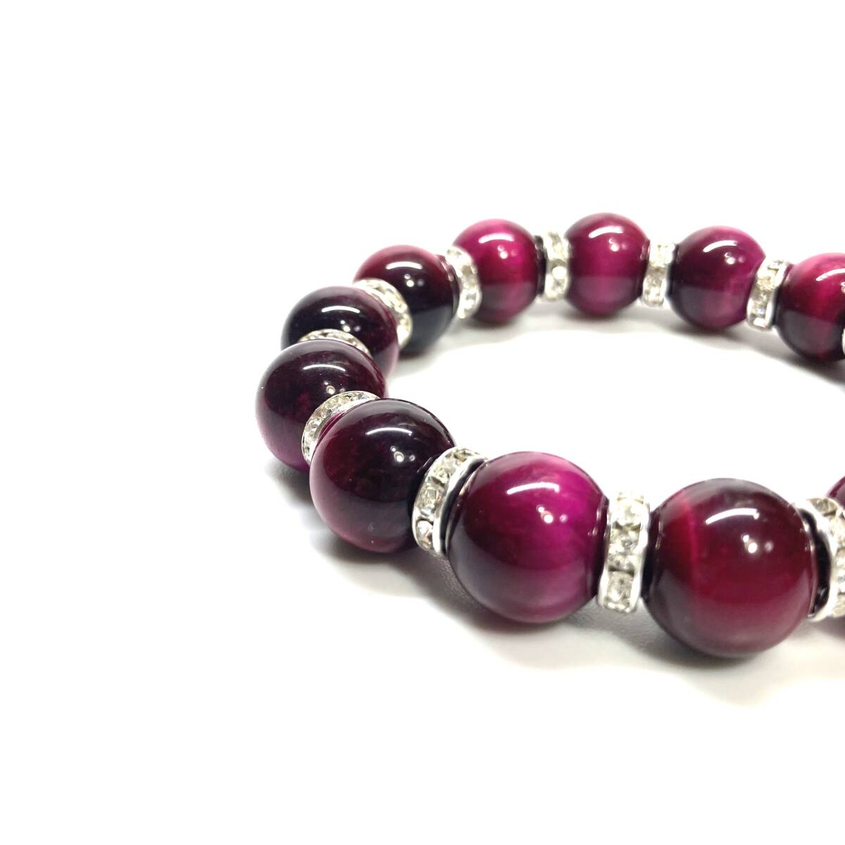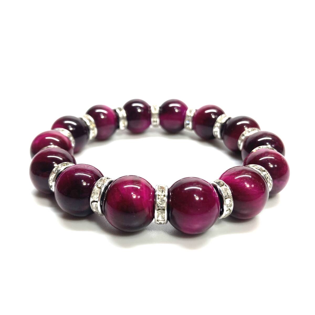 こちらは、14mm玉のピンクタイガーアイを使用したブレスレットです。石との間にはロンデルを挟み高級感を演出しています。シンプルなデザインですのでどんなコーディネートとも合わせ易いブレスレットです。石大きさは14mm玉です。内周約17cmです。パワーストーンを付けてる方へのプレゼントにもお勧めです。14mmサイズのリクエストが多々ありましたので少量ですが販売しました。気になる方はお早めにどうぞ。