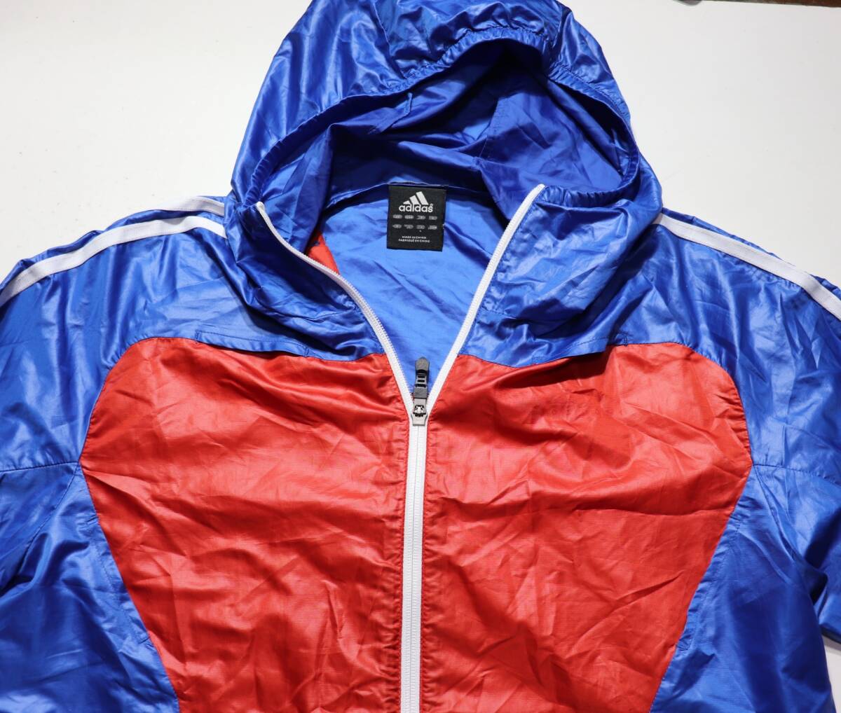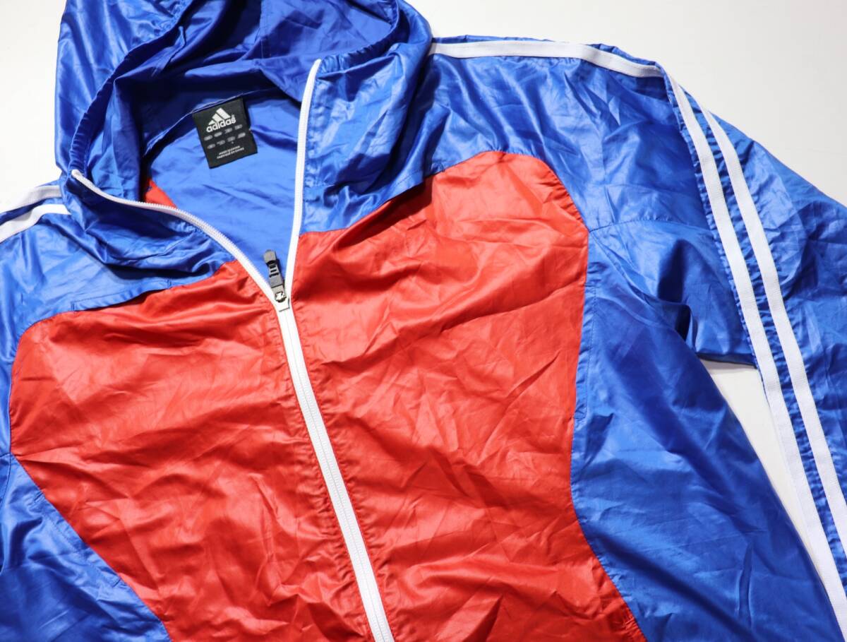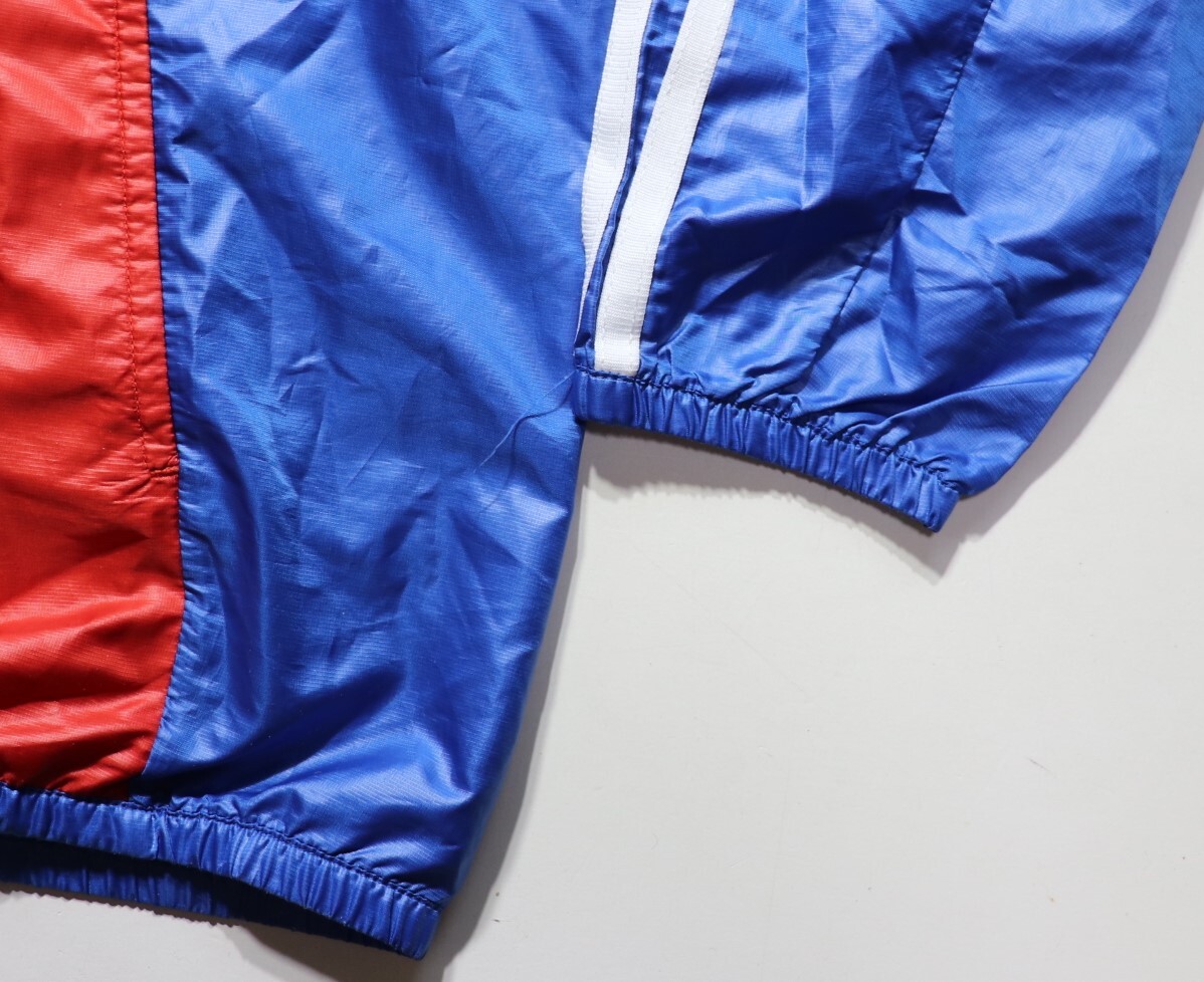 アディダスのジップアップのナイロンパーカーです。▲色はブルー×赤で素材はポリエステル100%です。▲程度:USEDですが破れやダメージになるような汚れ等はありません。古着を理解していただける方の入札を希望いたします。▲サイズ:Lで実寸では肩幅:ラグランスリープで首の中央から袖口までは80センチ、着丈70センチ、身幅;58センチです。▲他にも多数出品していますので、一度ご覧ください。