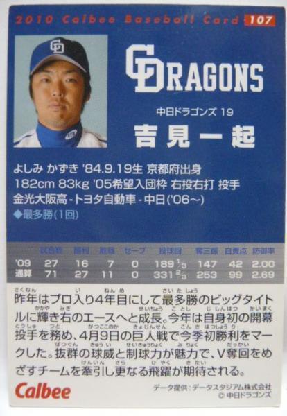 カルビープロ野球カード2010年#107【吉見 一起(中日ドラゴンズ)】平成22年チップスおまけ食玩トレーディングカード【中古】送料込