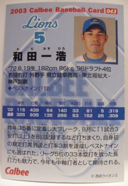 カルビープロ野球カード2003年#043【和田 一浩(西武ライオンズ)L】平成15年チップスおまけ食玩トレーディングカード【中古】送料込