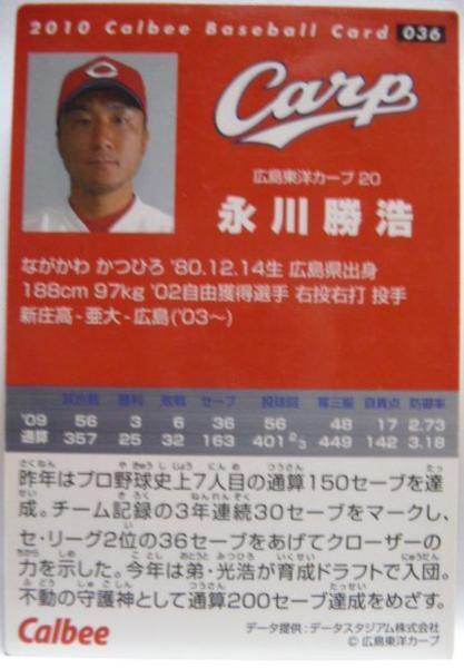 カルビープロ野球カード2010年#036【永川 勝浩(広島 東洋カープ)】平成22年チップスおまけ食玩トレーディングカード【中古】送料込