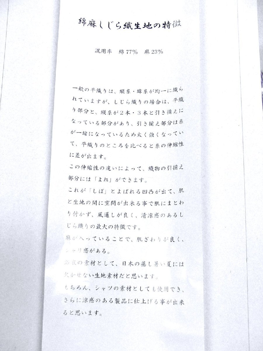 当店の休日は不定期ですから自己紹介に記載させていただきますのでご覧いただきますようお願いいたします。 ○o。 商品詳細 。o○ 涼しげな綿麻生地のキングサイズのゆかたの反物で日本製のお品になります。 記載によりますと生地は綿77%・麻23%でシジラ織生地のお品になります。 タグには次のような記載があります。 「綿麻シジラ織生地の特徴 一般の平織り生地は、縦糸緯糸が均一に織られておりますが、シジラ織の場合は、平織部分と、縦糸が2本・3本と引き揃えになっている部分があり、引き揃え部分は糸が一緒になっているため太く強くなっていて、平織のところを比べると糸の伸縮性に差が出ます。この伸縮性の違いによって、織物の引き揃え部分には「よれ」ができます。これが「シボ」と呼ばれる凸凹がでて、肌と生地の間に空間ができることで肌にまとわり付かず、風通しが良く、清涼感のあるシジラ織の最大の特徴です。麻が入っていることで、肌ざわりが良く、シャリ感がある。浴衣の素材として、日本の蒸し暑い夏には欠かせない生地素材だと思います。もちろん、シャツの素材としても使用でき、さらに涼感のある製品に仕上げることができると思います。 白井商事株式会社 」 記載されております「シボ」は無いお品になります。 シジラ織よりも小さな節の糸を使用した綿麻紬織風の生地だと思います。 淡いベージュ色系の素色のような色合いで細い縞模様のような柄の織物です。 涼しげな綿・麻シジラ織風のゆかたの反物はいかがですか。 お気に召しましたら入札をお願いいたします。 ○o。 商品の状態 詳細 。o○ 記載寸法 巾 40cm 長さ 12.0m 当店にて軽く検品いたしましたところ使用に差し障る目立つ難は無いように思いました。 ○o。 コメント 。o○ 卸し問屋さんのご好意で少しお値打ちに入荷いたしましたお品になります。 当店にて検品いたしまして使用に差し障る難は見つかりませんでした。 見落としがあることもございますから商品が到着いたしましたら至急に検品をお願いいたします。 もし万一わけあり品・難あり品以外で上記以外に難がございましたら商品到着より1週間以内で使用されたり、加工した状態でない当店発送時の状態の場合には返品をお受けいたします。 実物に近いお色目を再現できますよう注意して色の調整をいたしおりますが色を忠実に再現することはできません。 撮影時の光線の都合やパソコンのモニターの特性などにより少し違う色に見える場合がございます。 お品に近いお色目に仕上がっておりましたらご容赦願います。 ○o。発送詳細 。o○ 発送方法 クロネコヤマト 宅急便 ゆうパック | |||