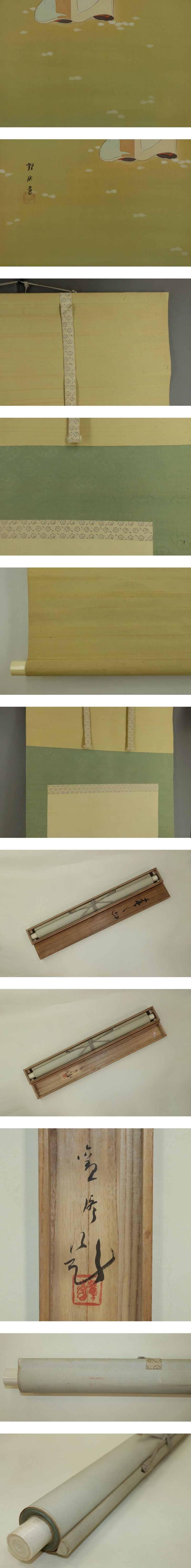 織田観潮 おだ-かんちょう 小堀鞆音に師事。尾竹国観。 明治22年12月東京生まれ。 新大和絵・文展日展委嘱。 人物・花鳥を得意とする。昭和36年歿。 本紙は、染み、汚れがあります。 表装は、染み、汚れ、折れ、皺、虫食い、くすみ、軸先にヒビがあります。 【サイズ】 作品 横約49cm×縦約140.5cm 表装 横約64.5cm×縦約230cm |