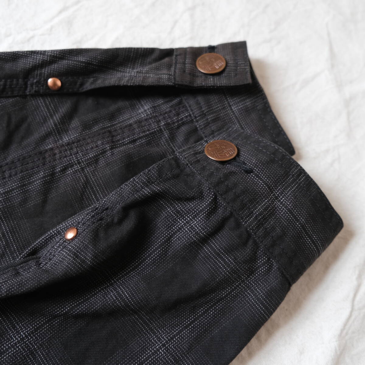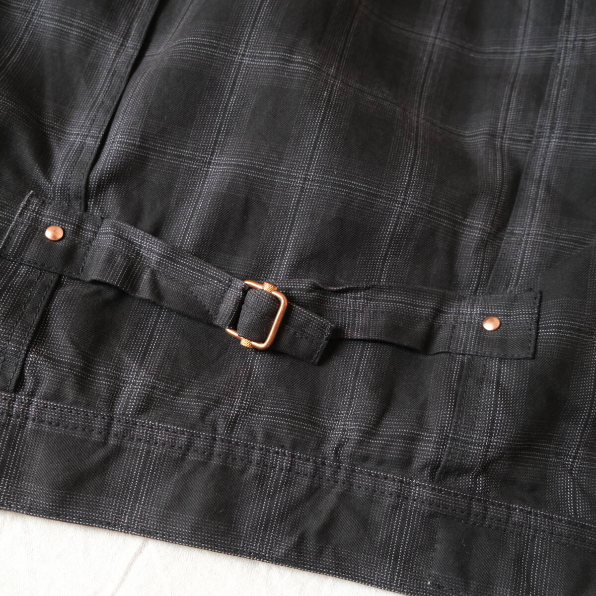 古いワークジャケットに見られるバックルや大きめのボタンや