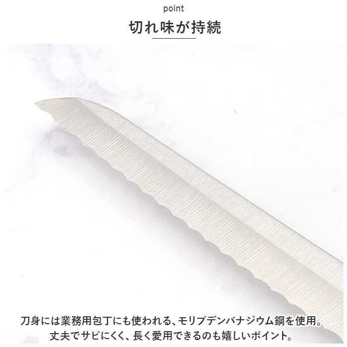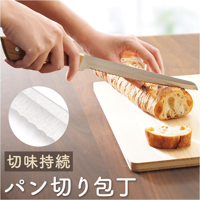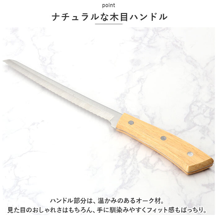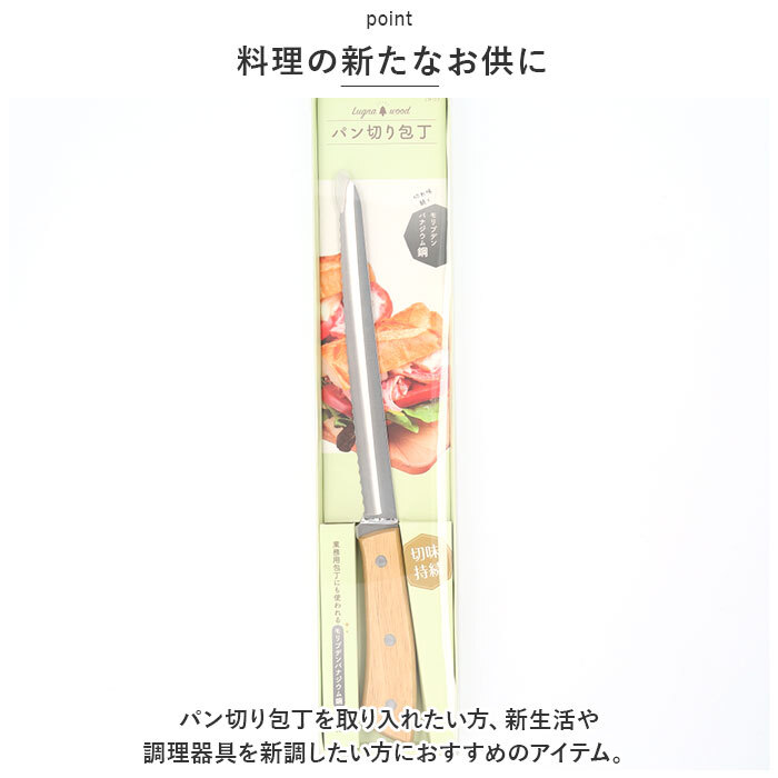 商品説明 | ・・パン好きな方のマストアイテム☆Lugna wood(ルグナウッド)のパン切り包丁が新登場。 ・【色んなパンに対応できる!】 ・一辺12.5cmの一斤パンもカットしやすい、刃付け部分約21cmサイズ。サンドイッチやバゲットサンドづくりにも♪ ・【ナチュラルな木目ハンドル】 ・ハンドル部分は、温かみのあるオーク材。見た目のおしゃれさはもちろん、手に馴染みやすくフィット感もばっちり。 ・【切れ味が持続】 ・刀身には業務用包丁にも使われる、モリブデンバナジウム鋼を使用。丈夫でサビにくく、長く愛用できるのも嬉しいポイント。 ・【料理の新たなお供に】 ・パン切り包丁を取り入れたい方、新生活や調理器具を新調したい方におすすめのアイテム。 |
