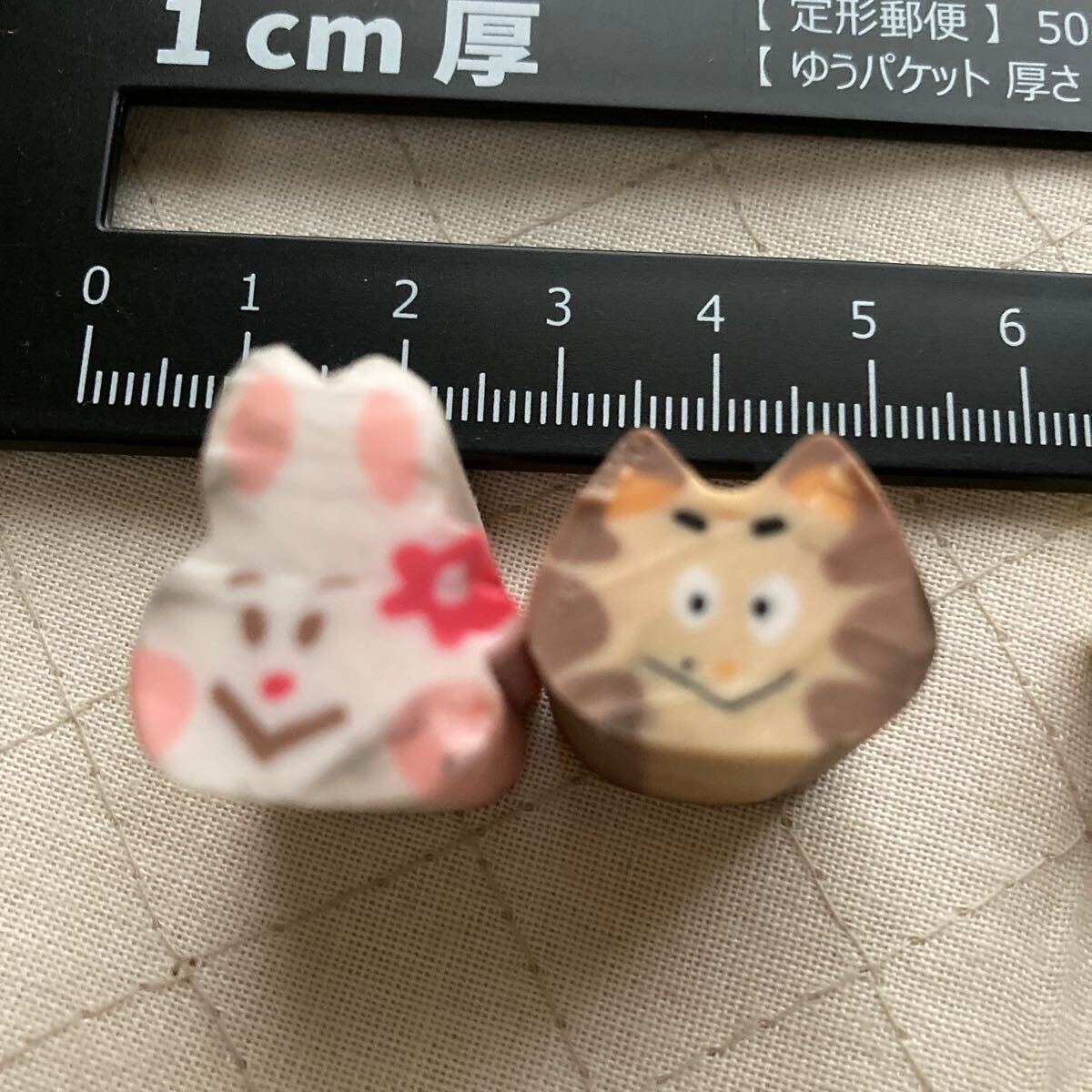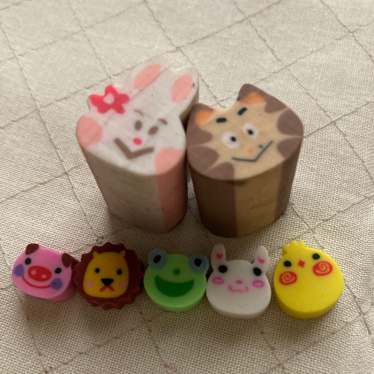 こちらは昭和レトロ ではありませんが、ウサギ ライオン ブタ カエル 鳥 ひよこ? インコ?、の可愛い金太郎消しゴム、お付けします。