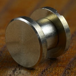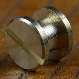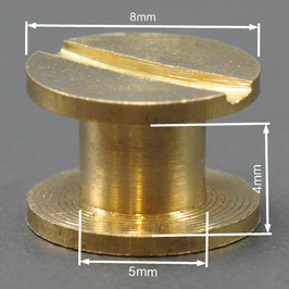 コンチョなどの製作に使う真鍮でできたシカゴスクリュー。双方ともに直径8mmの円形ヘッドでフラットな形状になっており、片方のねじはマイナスドライバーで締められるよう溝が付いています。