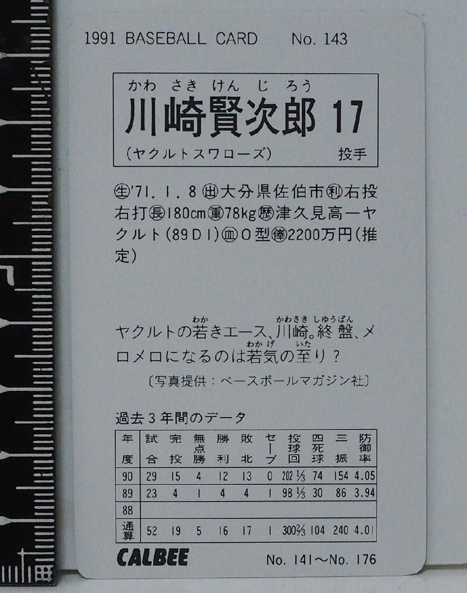 91年 カルビー プロ野球カード No.143【川崎 賢次郎 投手 ヤクルト スワローズ】平成3年 1991年 当時物 Calbeeおまけ食玩BASEBALL【中古】
