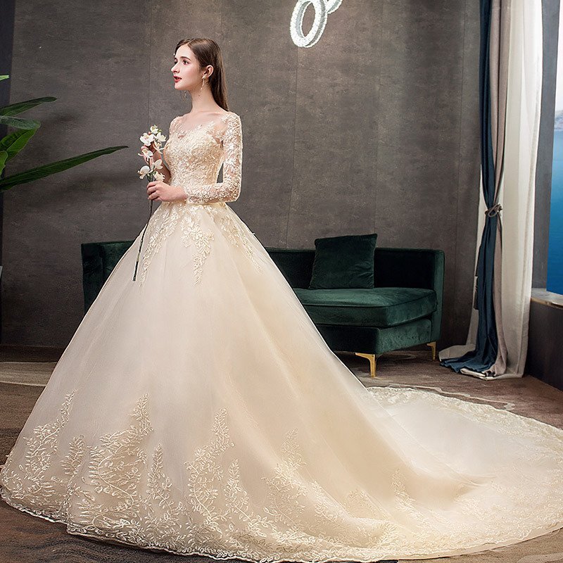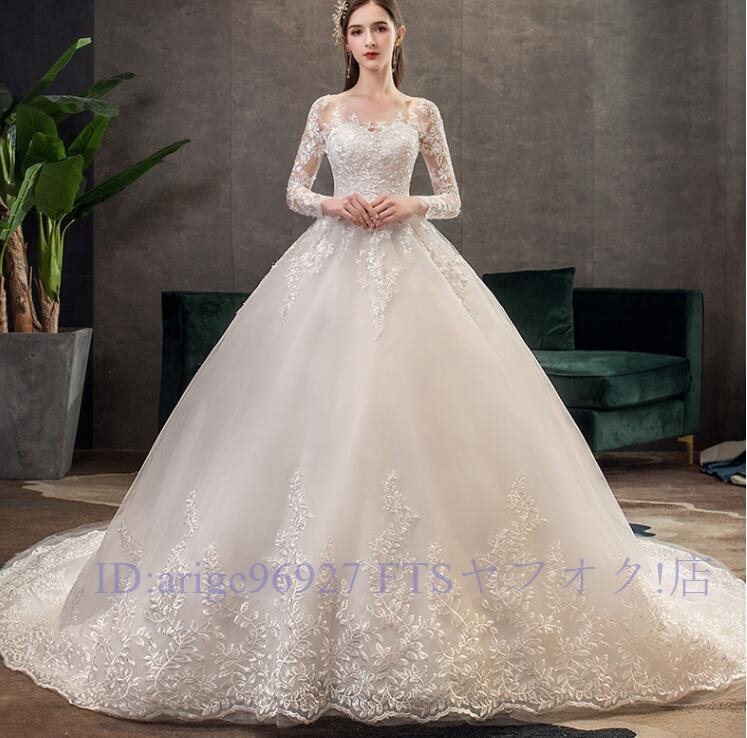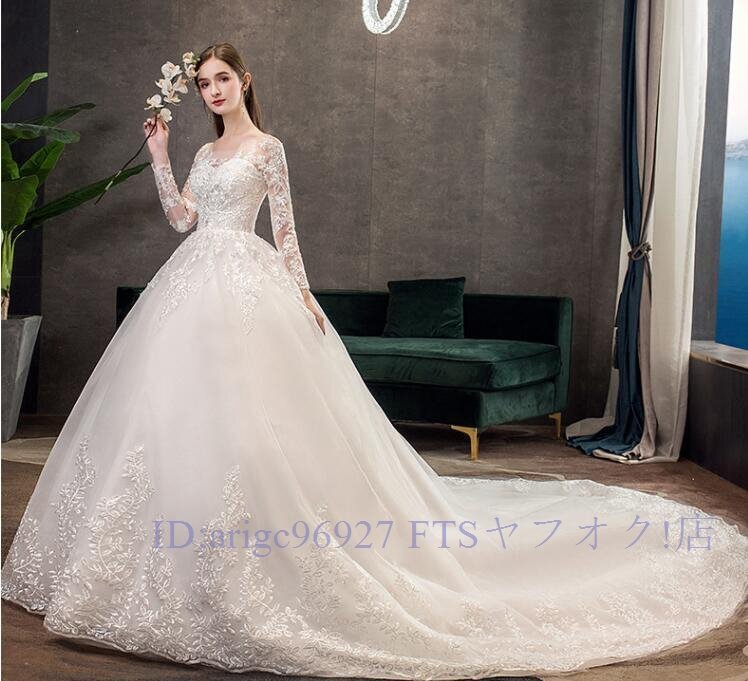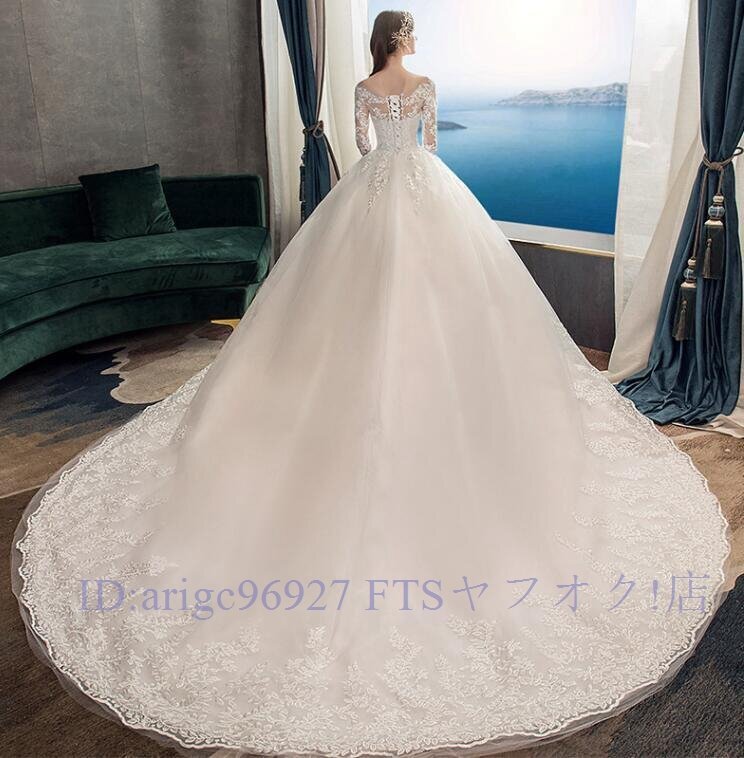 B0181☆新品レース ウェディングドレス トレーン 長袖 9分丈袖 オフショルダー 白 S~XXXL 大きいサイズ パニエ ベール グローブ付