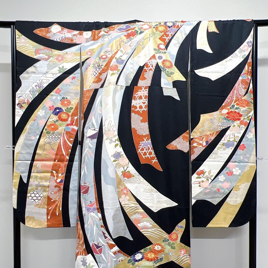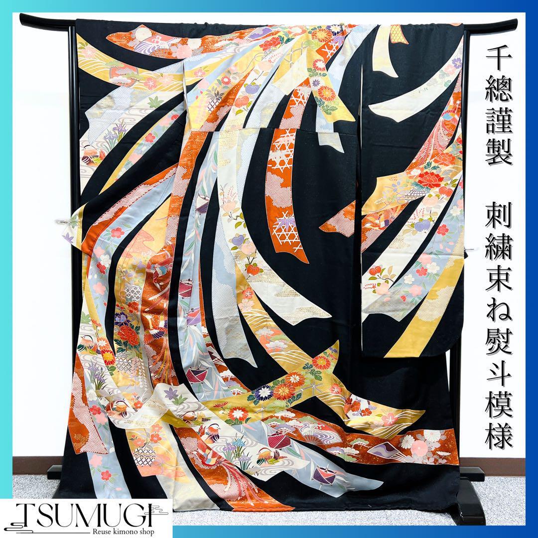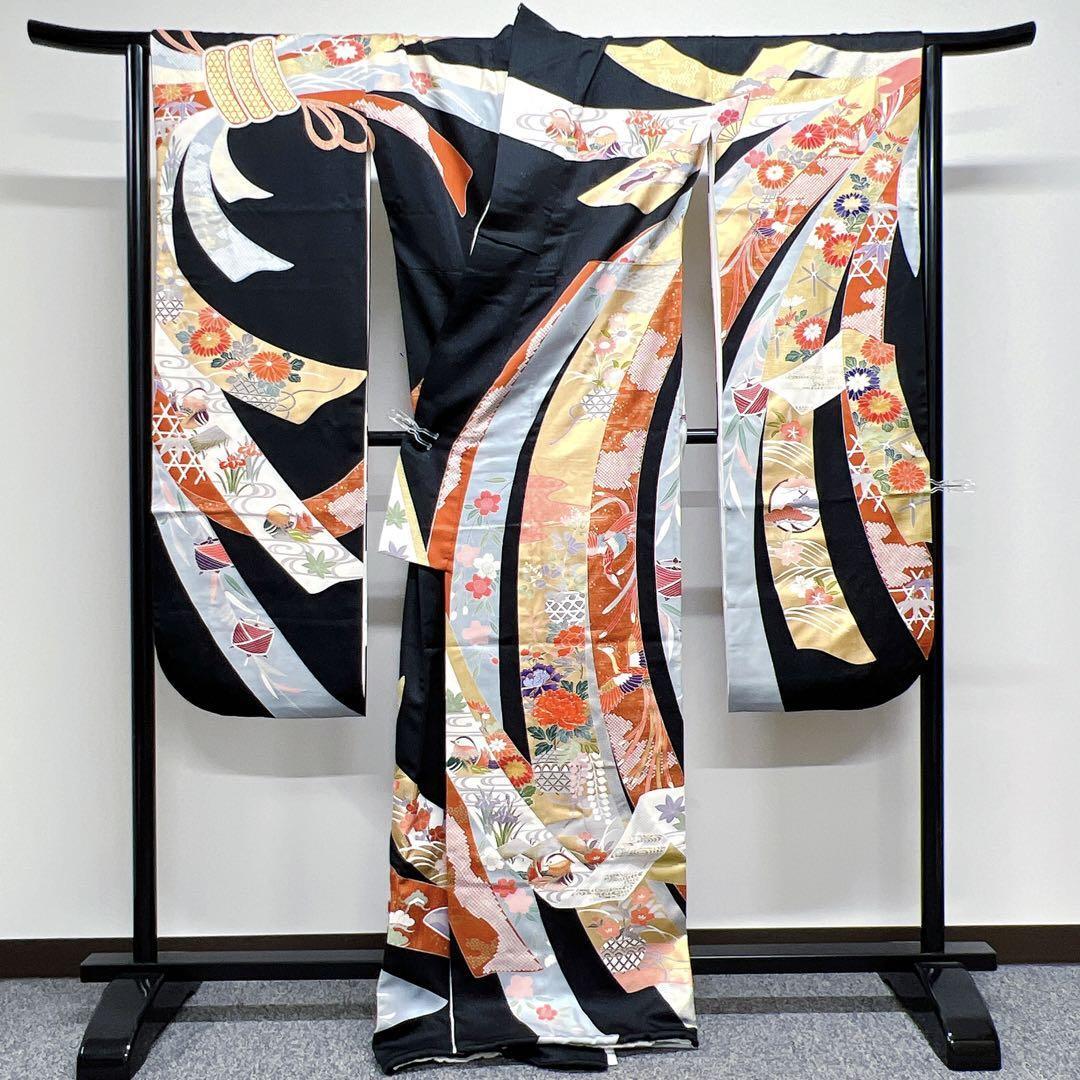 千總謹製 黒地に束ね熨斗 金通しに刺繍 振袖 着物