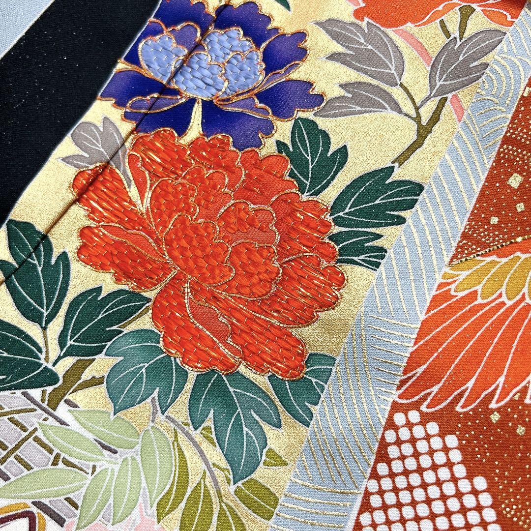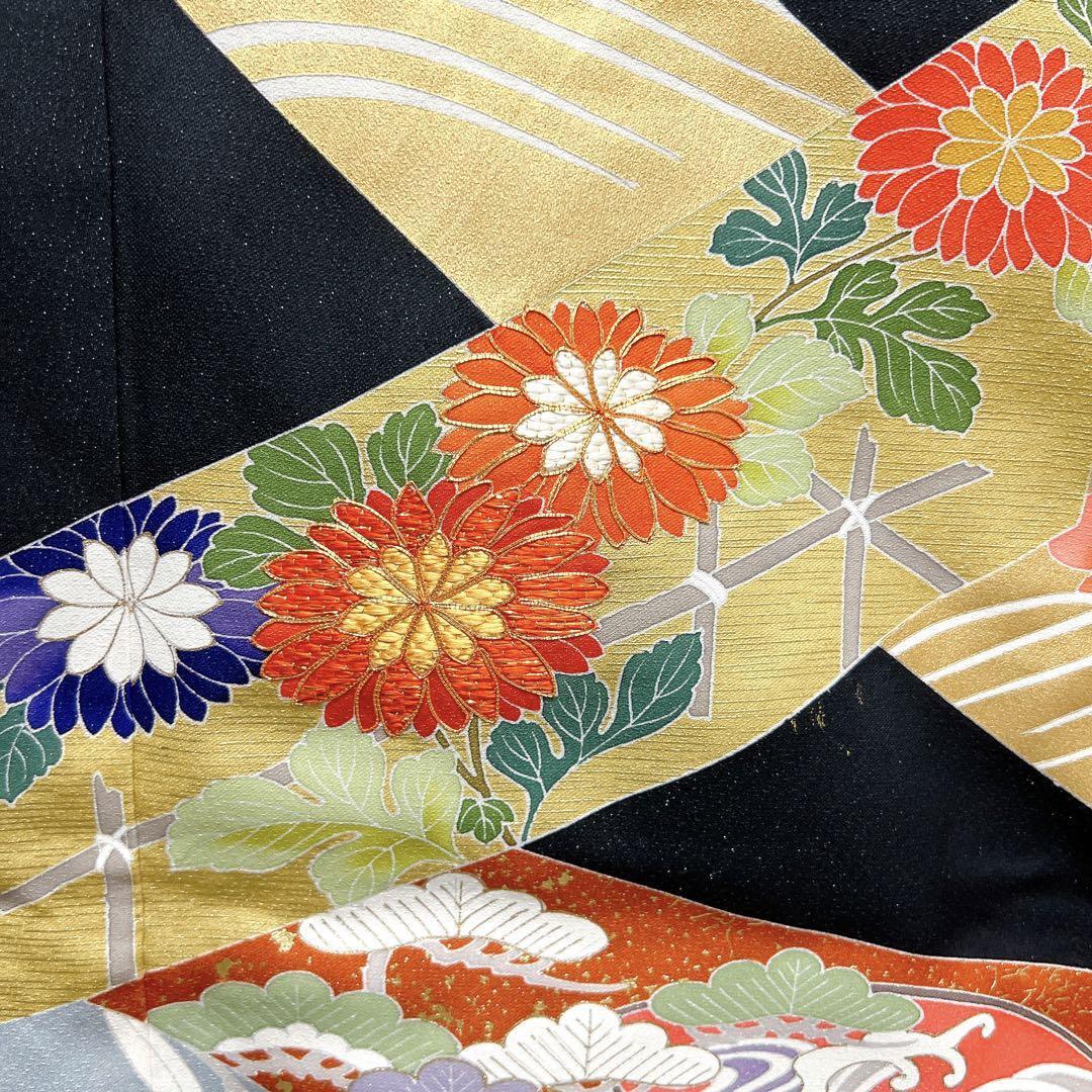 黒地に金通しが美しく光り、鮮やかな花の刺繍があしらわれています。